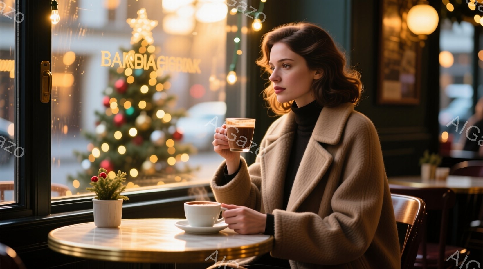 暖炉のそばのテーブルに座る女性は、キャメル色のコートと黒いセーターを着ています。彼女は横を向き、片手にカップを持って、物思いにふけっているような表情をしています。背景には、窓の外の街並み、そしてクリスマスツリーの飾り付けが見え、冬の暖かく、少し寂しげな雰囲気が漂っています。