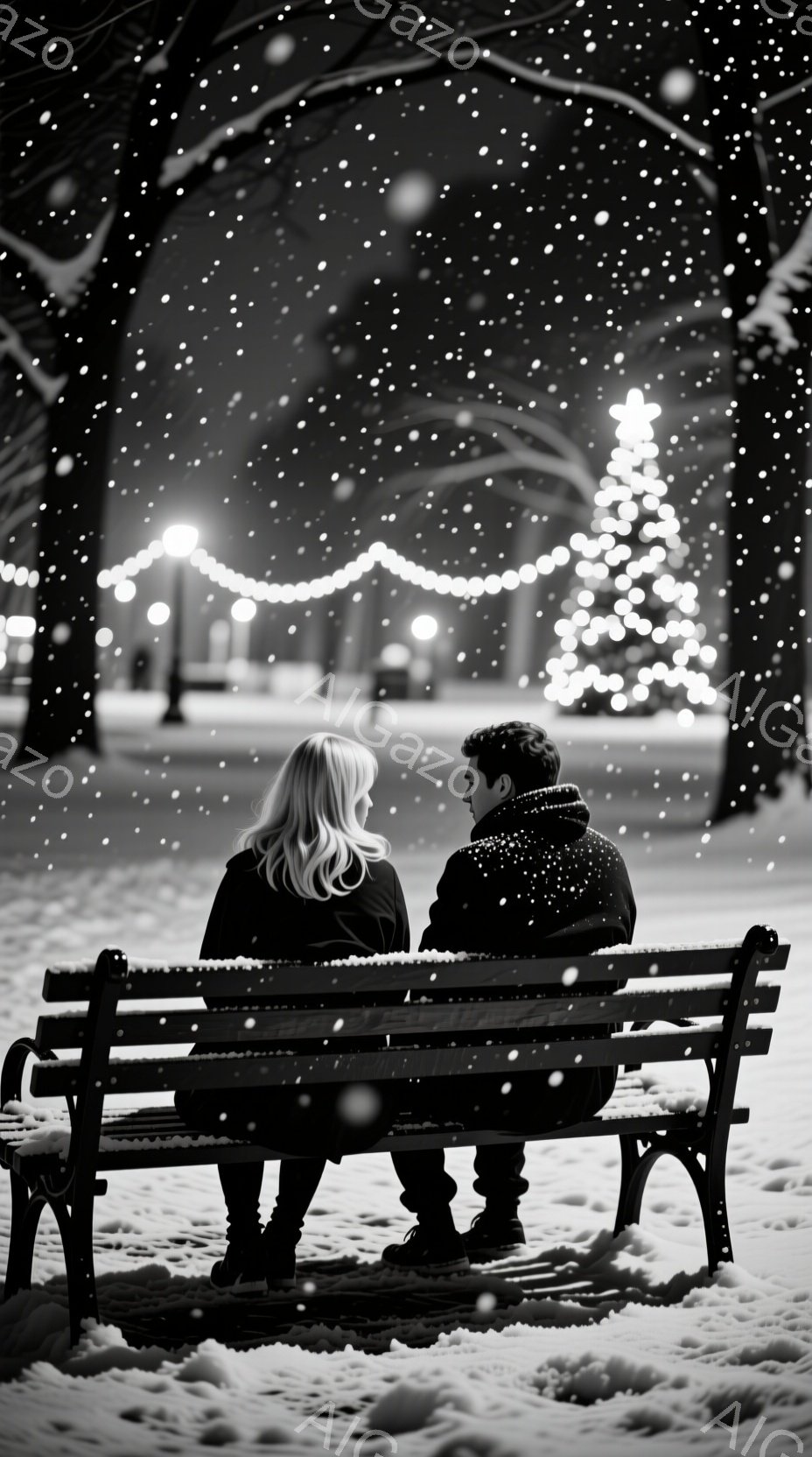 雪が降る夜、公園のベンチに寄り添って座る男女が描かれている。女性は明るい髪で、黒いコートを着ている。背景には、イルミネーションで飾られた木々と、ぼんやりとした街灯が見え、静かでロマンチックな雰囲気を醸し出している。