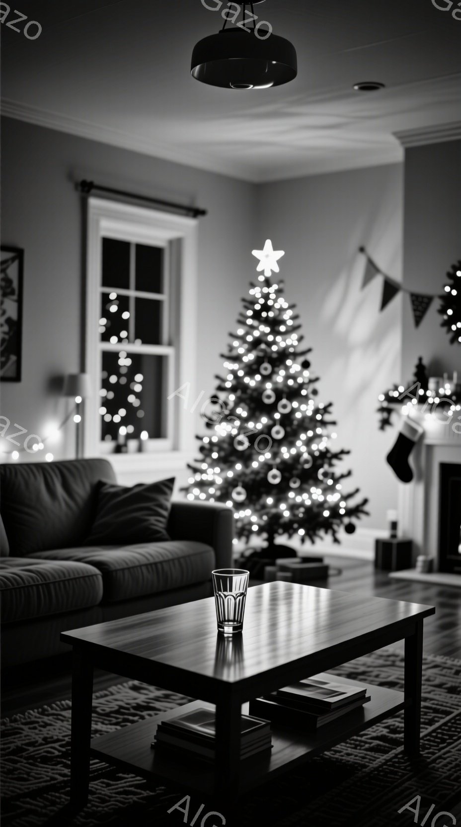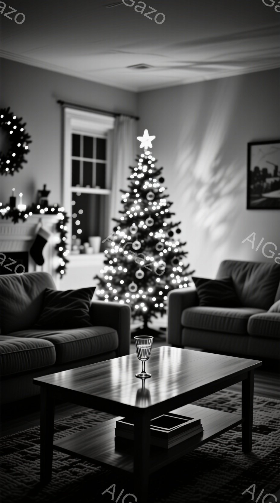 室内には、クリスマスツリーが飾られ、暖炉のそばには装飾が施された円形のリースが掛けられています。リビングルームの中央には、本の上にグラスが置かれたコーヒーテーブルがあり、壁際にはダークグレーのソファとクッションが置かれています。全体的に、温かく穏やかなクリスマスの雰囲気を感じさせる、落ち着いた室内空間です。