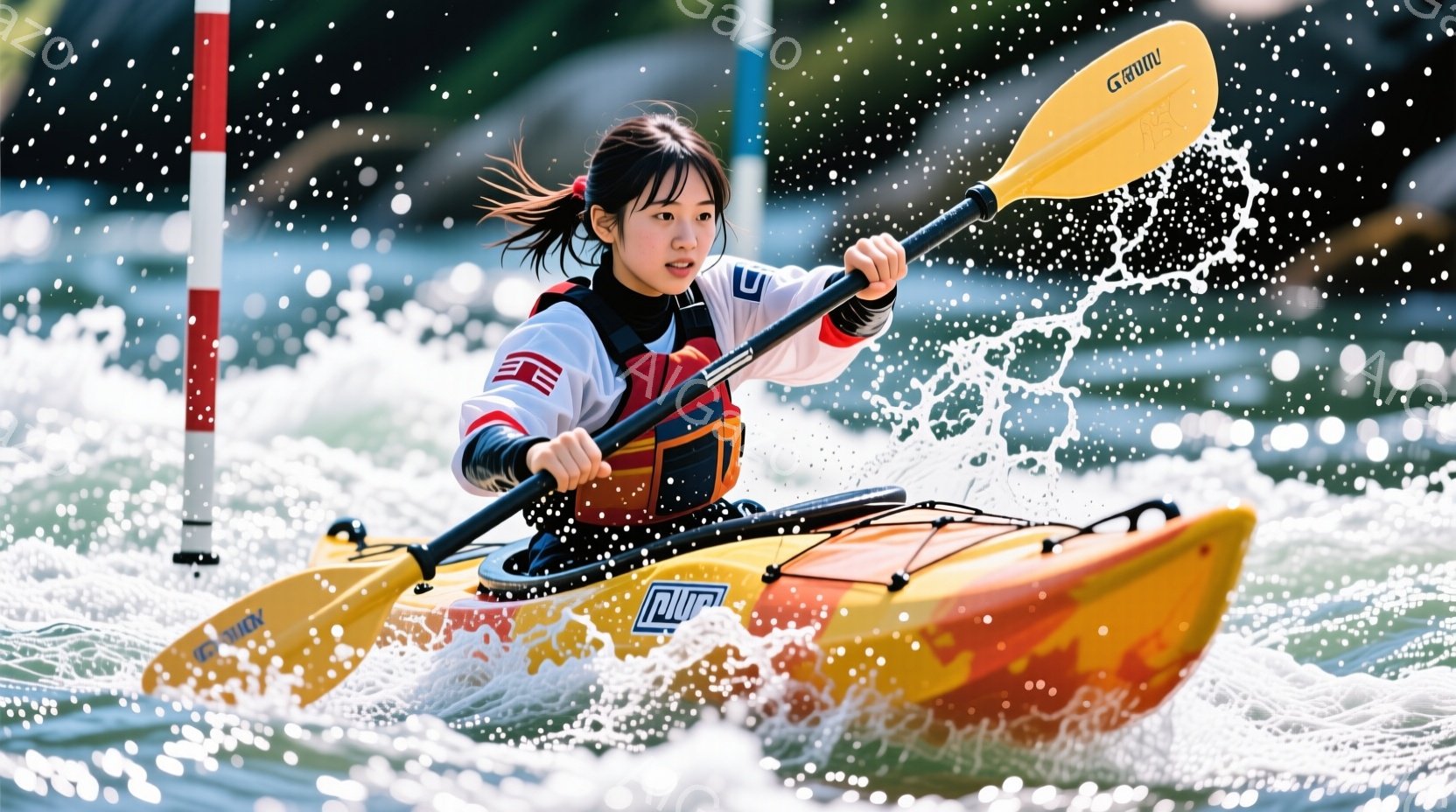 オレンジ色のカヤックに乗った女性が、水しぶきを上げながら力強く漕いでいる様子が写っている。彼女は髪をポニーテールにし、明るい笑顔を浮かべ、青と白のスポーツウェアを着用している。背景には緑の植物が見え、水面は太陽の光を反射して輝いており、活気に満ちた夏の日の雰囲気を醸し出している。