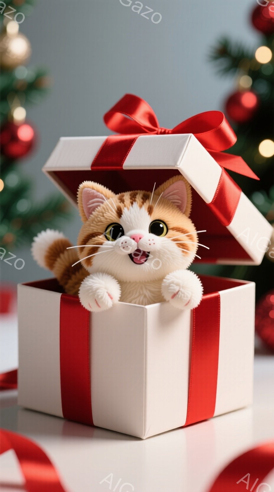 オレンジ色の毛並みの小さな子猫が、白いリボンで結ばれた箱の中から顔を出し、両手を広げて楽しそうに微笑んでいます。背景にはキラキラと輝くクリスマスツリーの飾りと白い毛布が見え、暖かく、お祝いムードに満ちた雰囲気が漂っています。全体的に、可愛らしくて幸せな瞬間を捉えた、心温まる画像です。