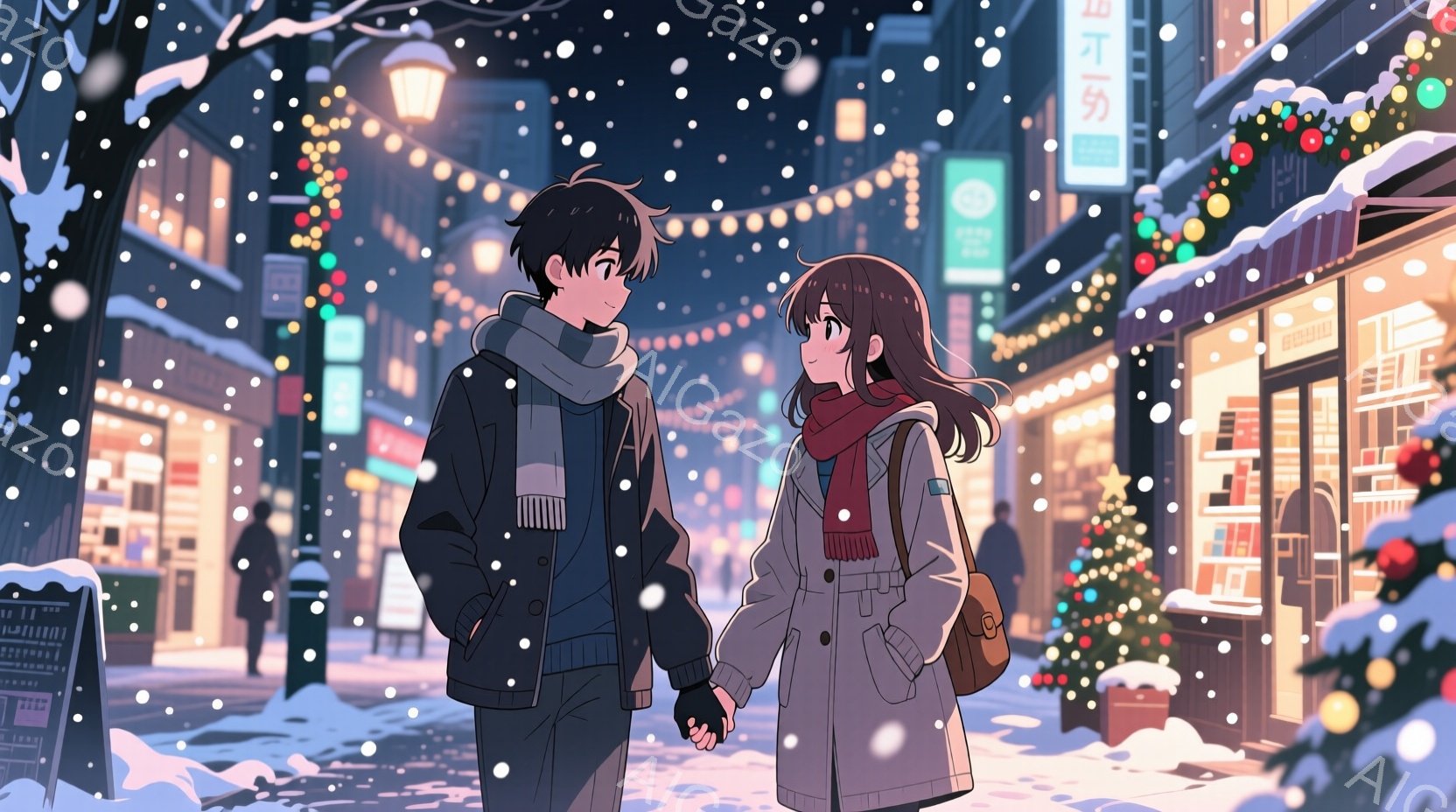 雪が降る夜の街並みを、若い男女が手をつないで歩いている。女性は肩までの長さの茶髪で、赤いマフラーとベージュのコートを着て、少し微笑んでいる。男性は黒いコートとマフラーで、女性を見つめており、背景にはクリスマスツリーやイルミネーションで飾られた建物が並び、温かくロマンチックな雰囲気を醸し出している。