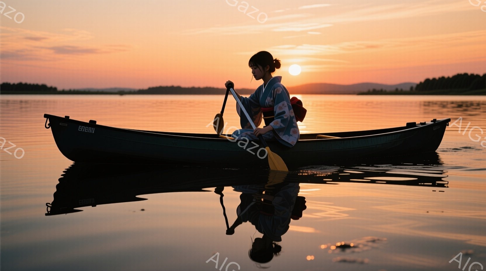 夕暮れ時の湖で、女性がボートを漕いでいる。彼女は落ち着いた表情で、グレーの着物を着ており、黒髪を後ろで結んでいる。背景には、オレンジ色に染まった空と、遠くに見える山々が広がっており、穏やかで静寂な雰囲気を醸し出している。