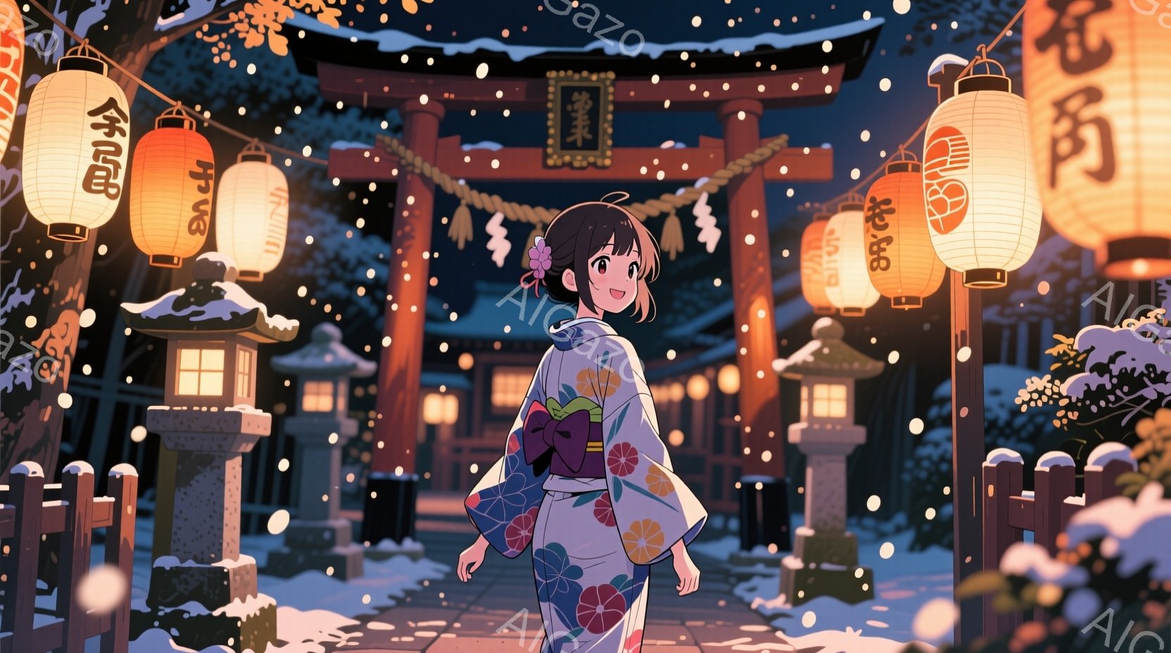 雪が降る中、和服を着た若い女性が石灯籠が並ぶ通りを歩いている。彼女は明るい笑顔で、肩に花飾りをつけ、足元には伝統的な日本の靴を履いている。背景には、提灯が灯る木造建築が並び、冬の静かで幻想的な雰囲気を醸し出している。