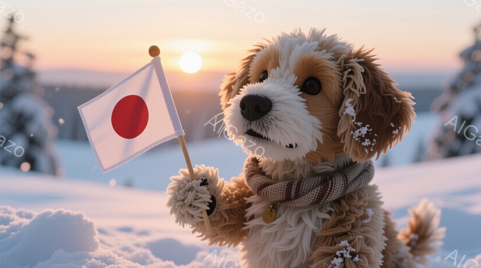 白い雪の上に立つ、茶色と白の毛並みの可愛い犬が、日本の国旗を高く掲げています。犬は赤い首輪を付けており、雪が少し付いた前足で旗を支え、正面を見て明るい表情をしています。背景には、夕焼けに照らされた山々と、雪に覆われた風景が広がっており、温かく希望に満ちた雰囲気を感じさせます。