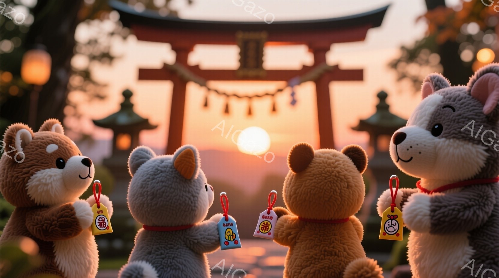 四匹の愛らしいぬいぐるみが、鮮やかな朱色の鳥居を背景に並んで立っています。それぞれ首に赤い紐と小さな鈴をつけ、まるで参拝客のように見えます。背景には夕焼けが広がり、鳥居を照らし出し、穏やかで神秘的な雰囲気を醸し出しています。
