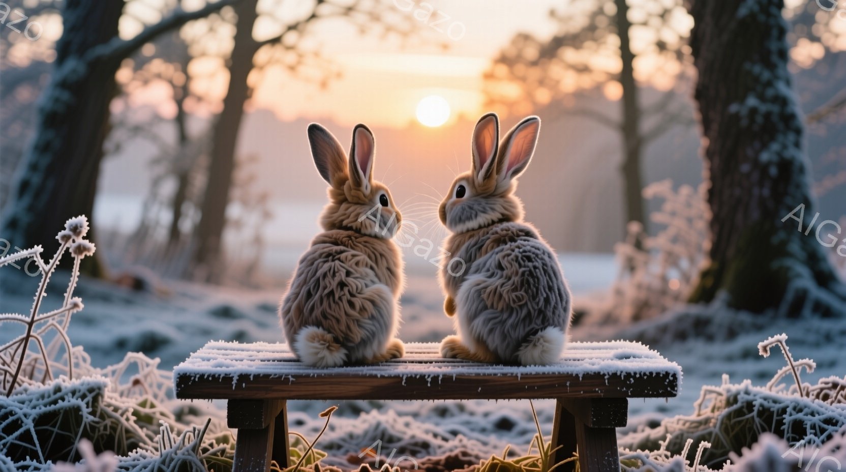 霜で覆われた草の上に置かれた小さな木製の台に、毛並みの美しい2羽のウサギが寄り添って座っています。背景は霧のかかった冬の森で、日の出または日没の柔らかな光が差し込み、全体的に穏やかで幻想的な雰囲気を醸し出しています。ウサギたちは互いに背を寄せ合い、静かに景色を眺めているようです。