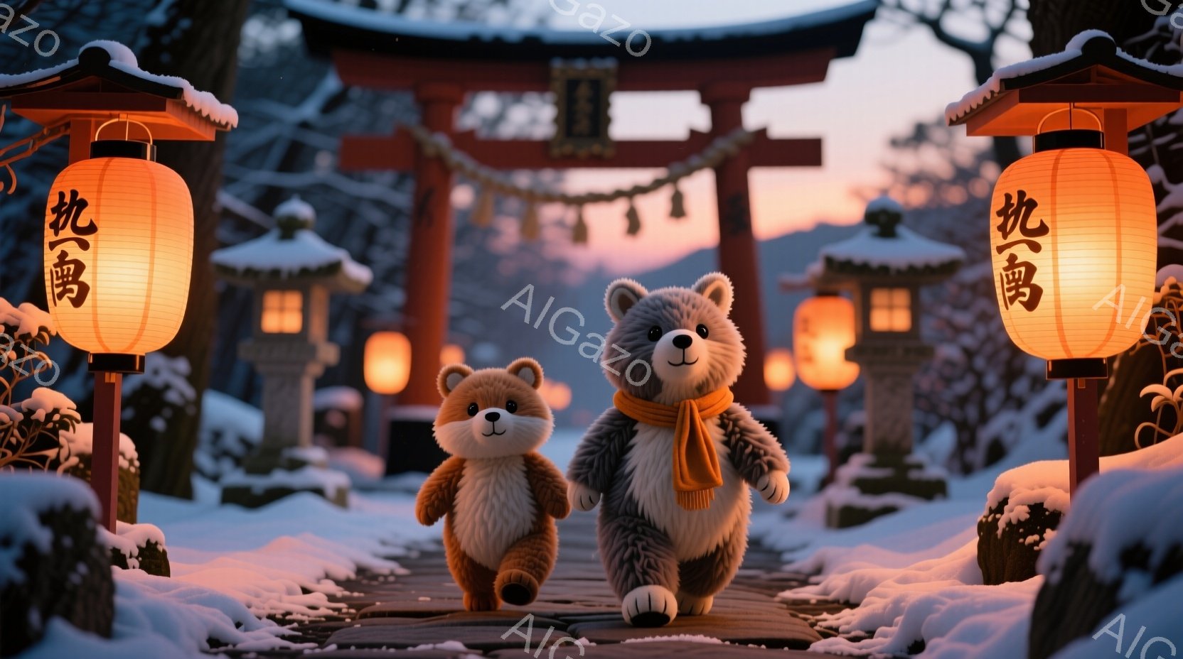 雪が降り積もる冬の風景の中に、クマと犬のキャラクターが並んで歩いている。二匹は茶色のニット帽とマフラーを身に着け、暖かい服装で冬の寒さをしのいでいる。背景には鮮やかな朱色の鳥居が立ち並び、幻想的な雰囲気を醸し出している。