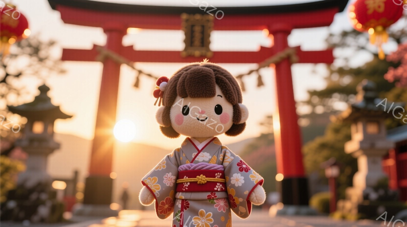 この無料AI生成画像「可愛らしい人形が、鮮やかな青い着物に身を包み、赤い帯で結ばれています。人形は正面を向き、つぶらな瞳と微笑みが愛らしい表情をしています。背景には、桜の花びらが舞い散る中、朱色の鳥居と石灯籠が立ち並び、夕焼け空が暖かく優しい雰囲気を醸し出しています。」は、2025年11月02日に作成されました。 サイズは 1664×928px の高解像度で、商用利用も可能なフリー素材として提供しています。