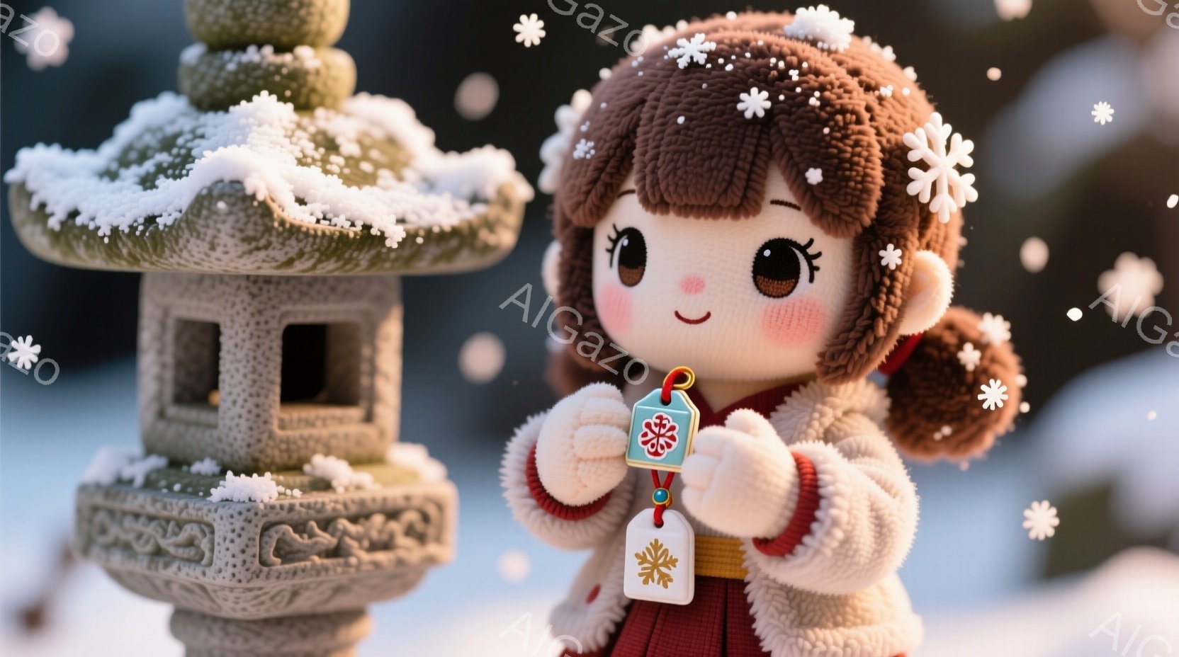 雪が舞う中で、可愛らしい人形が日本の伝統的な衣装を着ています。人形は茶色の巻き毛に白い花飾りをつけ、柔らかな笑顔を浮かべています。背景には雪を頂いた石灯籠があり、静かで幻想的な冬の雰囲気を醸し出しています。