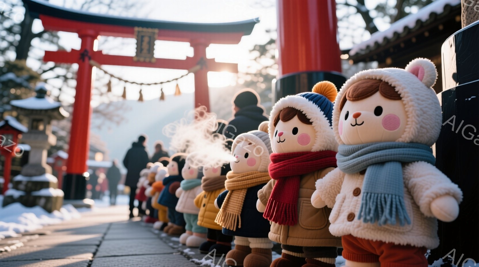 赤い鳥居が背景に広がる雪景色の中で、可愛らしい人形たちが一列に並んでいます。人形たちはそれぞれ異なる色の帽子とマフラーを身につけ、白い顔に愛らしい表情を浮かべており、口からは湯気が立ち上っています。雪が積もった石畳の道と、遠くに見える参拝者の姿が、冬の静かで温かい雰囲気を醸し出しています。