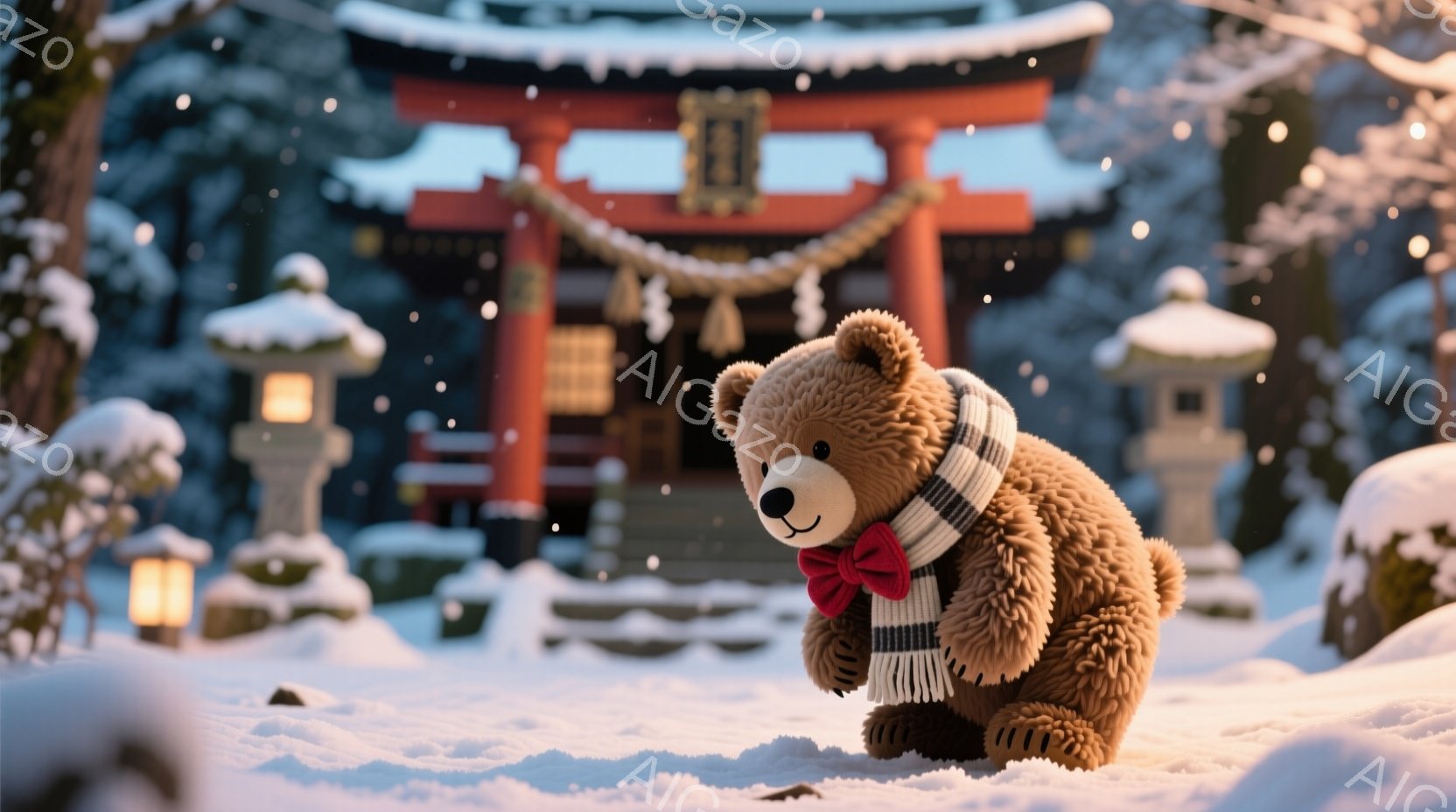 ふわふわの茶色のクマが雪の中に立っており、首にチェック柄の白いマフラーを巻いています。背景には雪化粧した鳥居と提灯があり、穏やかな冬の夜の情景が広がっています。雪が降り積もり、暖色系の光がクマと背景を照らし、温かく優しい雰囲気を醸し出しています。