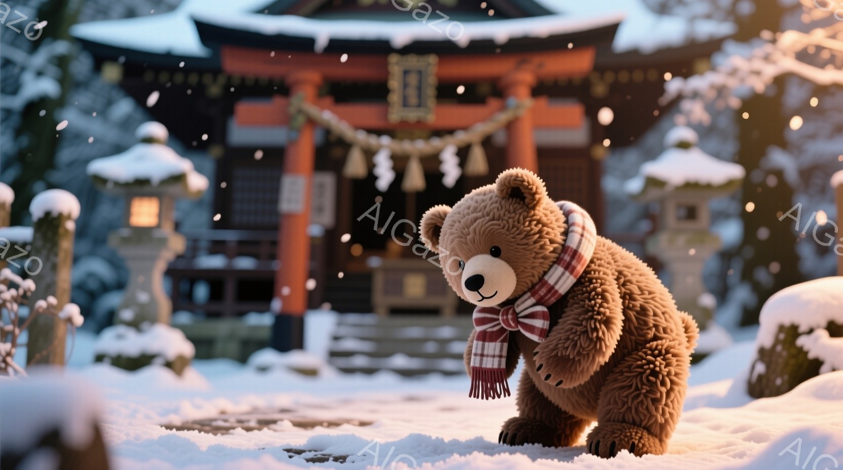 茶色のテディベアが雪景色の中で、赤いリボンと縞模様のショールで暖かく身を包んでいます。ベアは雪の上に座っており、少し微笑んでいるように見え、優しい表情をしています。背景には雪で覆われた階段と鳥居、そしてぼんやりと光る雪の中の灯篭があり、静かで冬らしい雰囲気を醸し出しています。