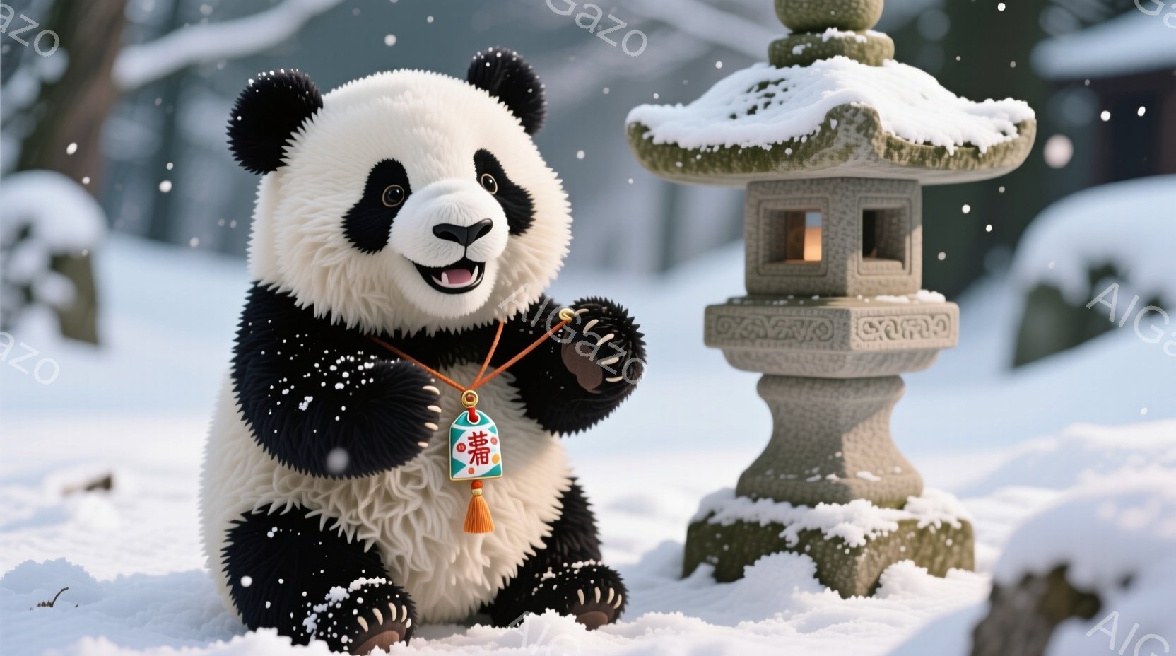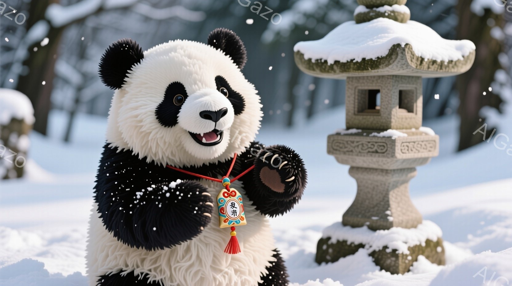白い雪景色の中にパンダが立っており、赤い紐のついた首飾りを身に着けている。パンダは満面の笑みを浮かべ、両手を前に出して親しげな印象を与えている。背景には雪を被った石灯籠が立ち、雪が舞う静かで穏やかな冬の雰囲気を醸し出している。