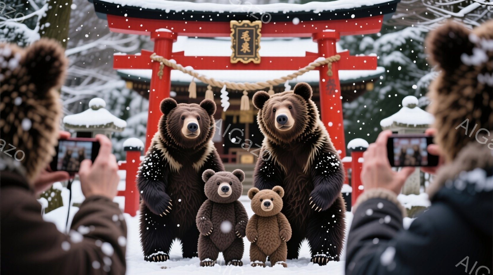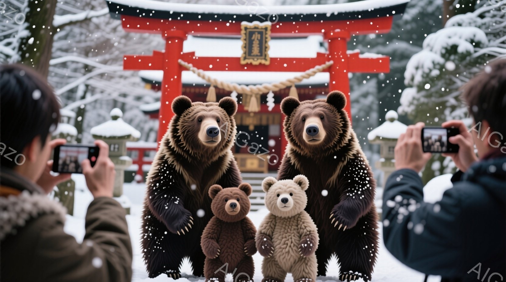 雪景色の中に、大きなクマのぬいぐるみ3体が並んで立っています。後ろには赤い鳥居があり、雪をかぶった石灯籠も確認できます。誰かがスマートフォンで彼らを写真に撮っており、冬の温かい雰囲気を醸し出しています。
