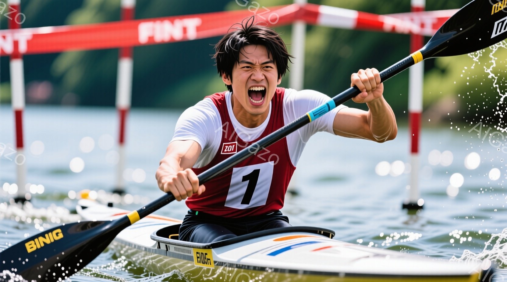 オレンジ色の夕焼けを背景に、カヤックに乗った男性が描かれている。彼は黒髪で、オレンジ色のライフジャケットを着用し、カヤックを漕ぐために片手をパドルに伸ばしている。水面は穏やかで、遠くにはぼんやりと陸地が見え、静かで平和な雰囲気を醸し出している。