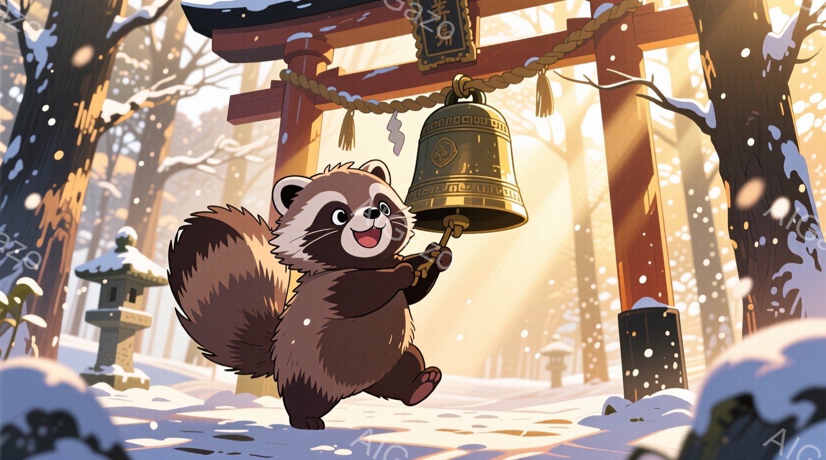 雪が舞う冬の寺院の前に、可愛らしいアライグマが立っている。アライグマは毛並みの良い茶色の毛並みで、大きな鐘の綱を両手で握り、嬉しそうに鐘を鳴らそうとしている。背景には、雪化粧された赤い鳥居や寺院の建物が見え、幻想的で温かい雰囲気を醸し出している。
