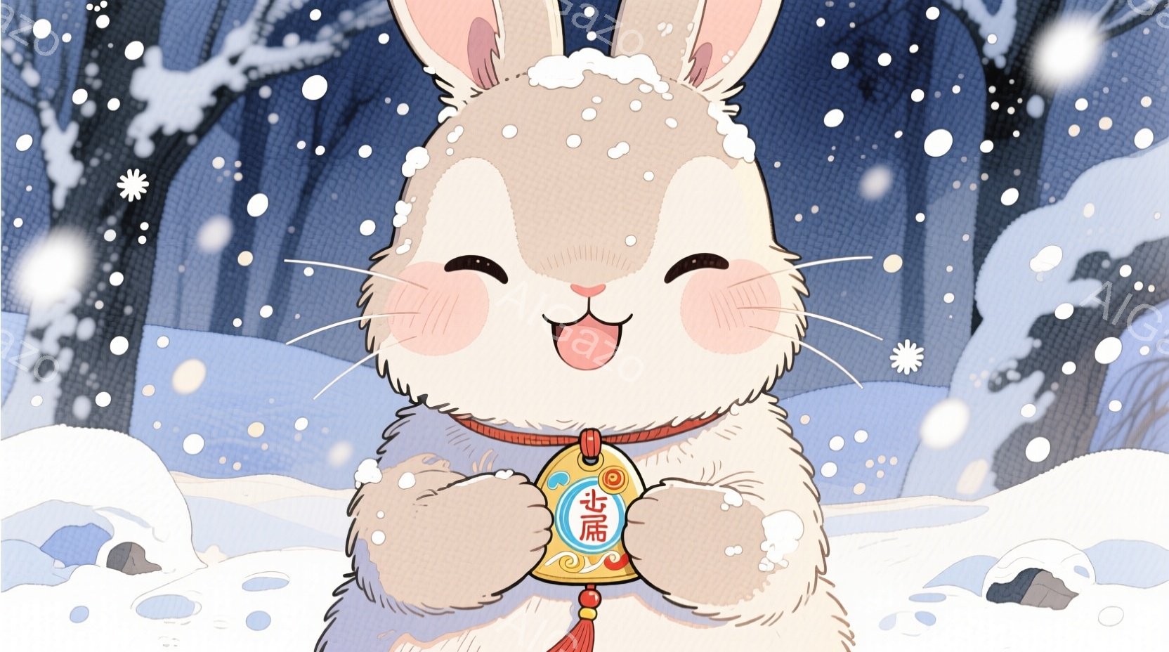白いウサギが正面を向いて立っており、可愛らしい表情をしています。赤い首輪には、漢字が書かれた青い飾り下げがついています。背景は雪景色で、遠くにぼやけた木々が見え、全体的に暖かく、お祝いの雰囲気が漂っています。