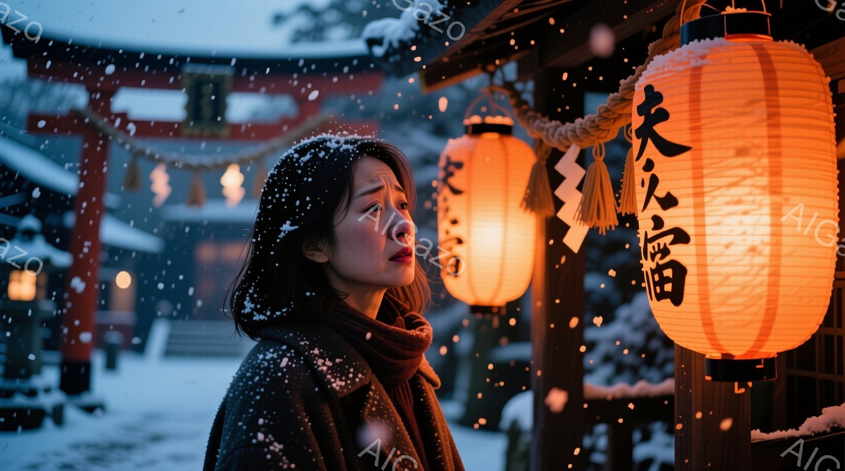 濃い茶色のセーターとスカーフを身につけた女性が、雪が降る寺院の前に立っている。彼女は黒髪で、少し憂いのある表情をしている。背景には、雪化粧された寺院の建物と、暖かく光る提灯が見え、静かで物憂げな雰囲気を醸し出している。