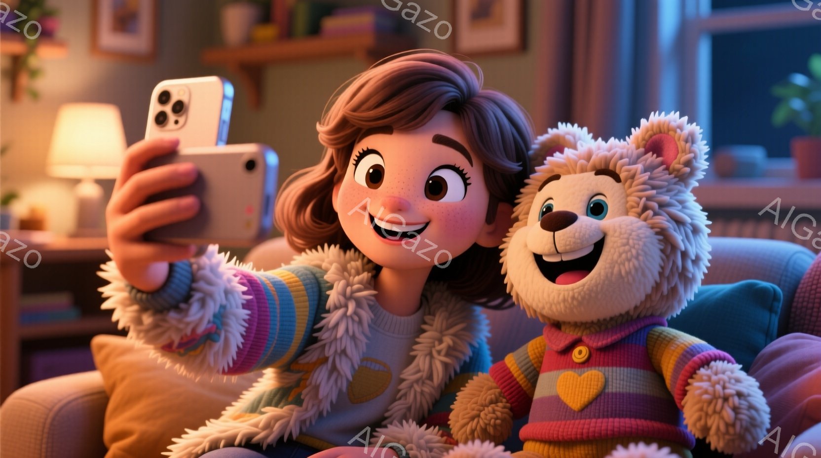 この無料AI生成画像「少女は、ふわふわのオフホワイトのニットカーディガンと、緑と黄色のストライプが入ったトップスを着て、ソファに座っています。彼女は明るい笑顔を浮かべ、片手にスマートフォンを持ち、自撮りをしています。背景には本棚や枕、温かい色の照明があり、全体的に温かく幸せな雰囲気を醸し出しています。」は、2025年11月02日に作成されました。 サイズは 1664×928px の高解像度で、商用利用も可能なフリー素材として提供しています。