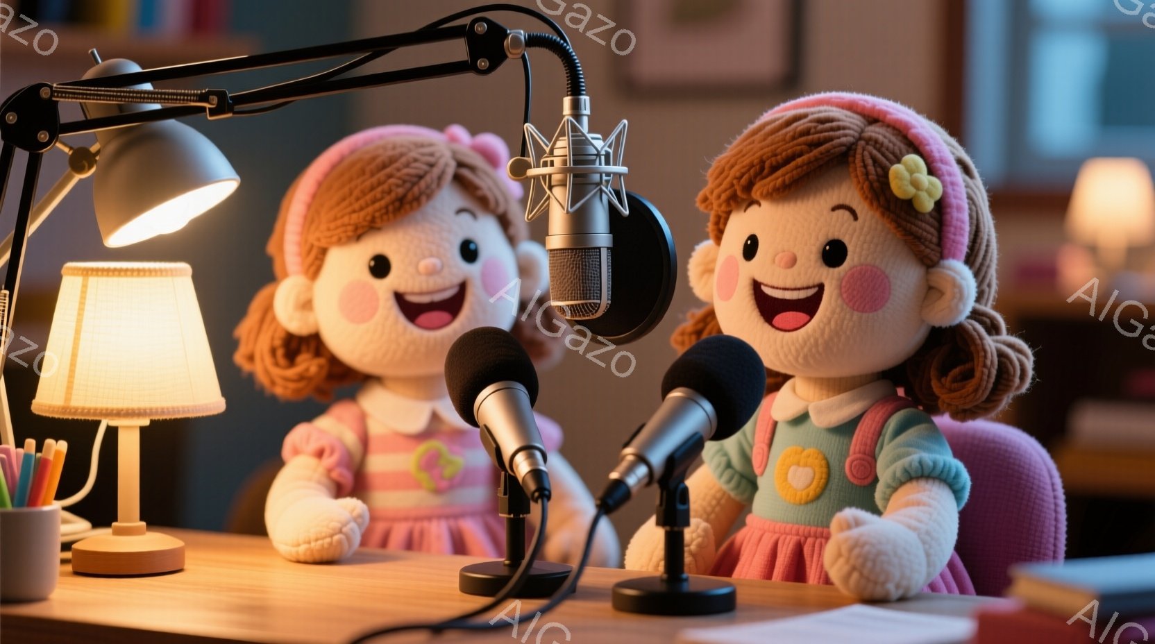 ふたつの人形が麦わら帽子をかぶり、明るいピンク色の椅子に座ってマイクに向かっています。人形は明るい色の服を着ており、笑顔で楽しそうに見えます。背景には、柔らかい光を放つランプと、ぼやけた家具が見え、全体的に暖かく、親しみやすい雰囲気です。