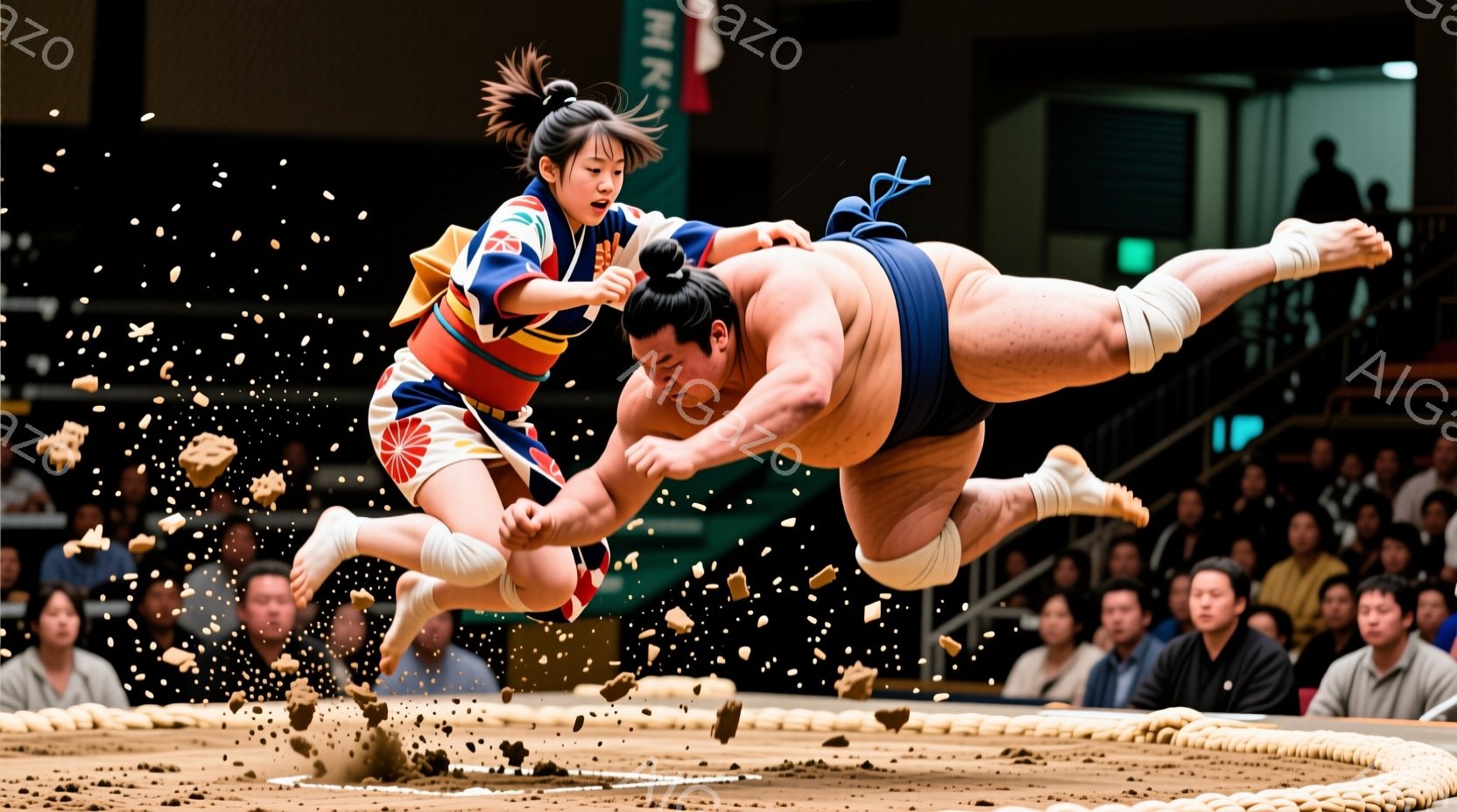 土俵の上で、一人の女性が華やかな着物姿で、力士に飛び蹴りを放とうとしている瞬間が捉えられています。力士は驚いた表情で、土俵から落ちそうになり、周囲には土が舞い上がっています。背景には観客席が見え、緊迫感と躍動感に満ちた雰囲気です。