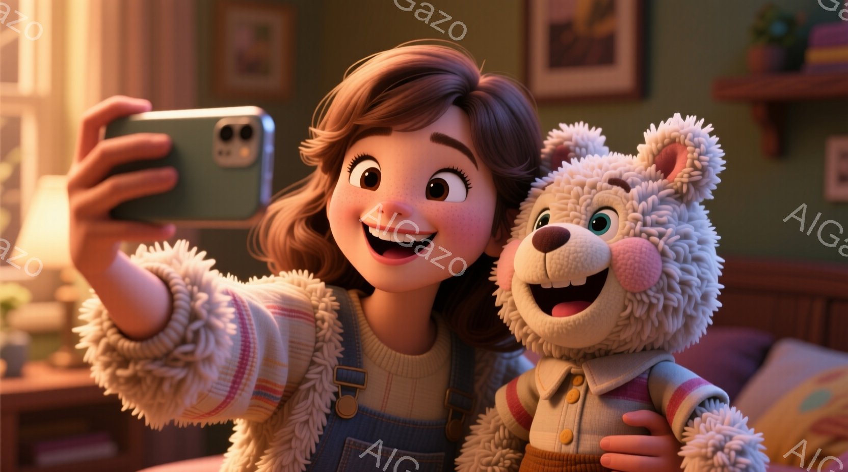 明るいピンク色のベッドに座る少女が、手にスマートフォンを持って何かを見ています。彼女は毛羽立ちのあるベージュ色のセーターとスカートを着ており、茶色の短い髪は肩にかかっています。背景には窓から差し込む光と、隣に座っているふわふわのテディベアが見え、全体的に温かく穏やかな雰囲気が漂っています。