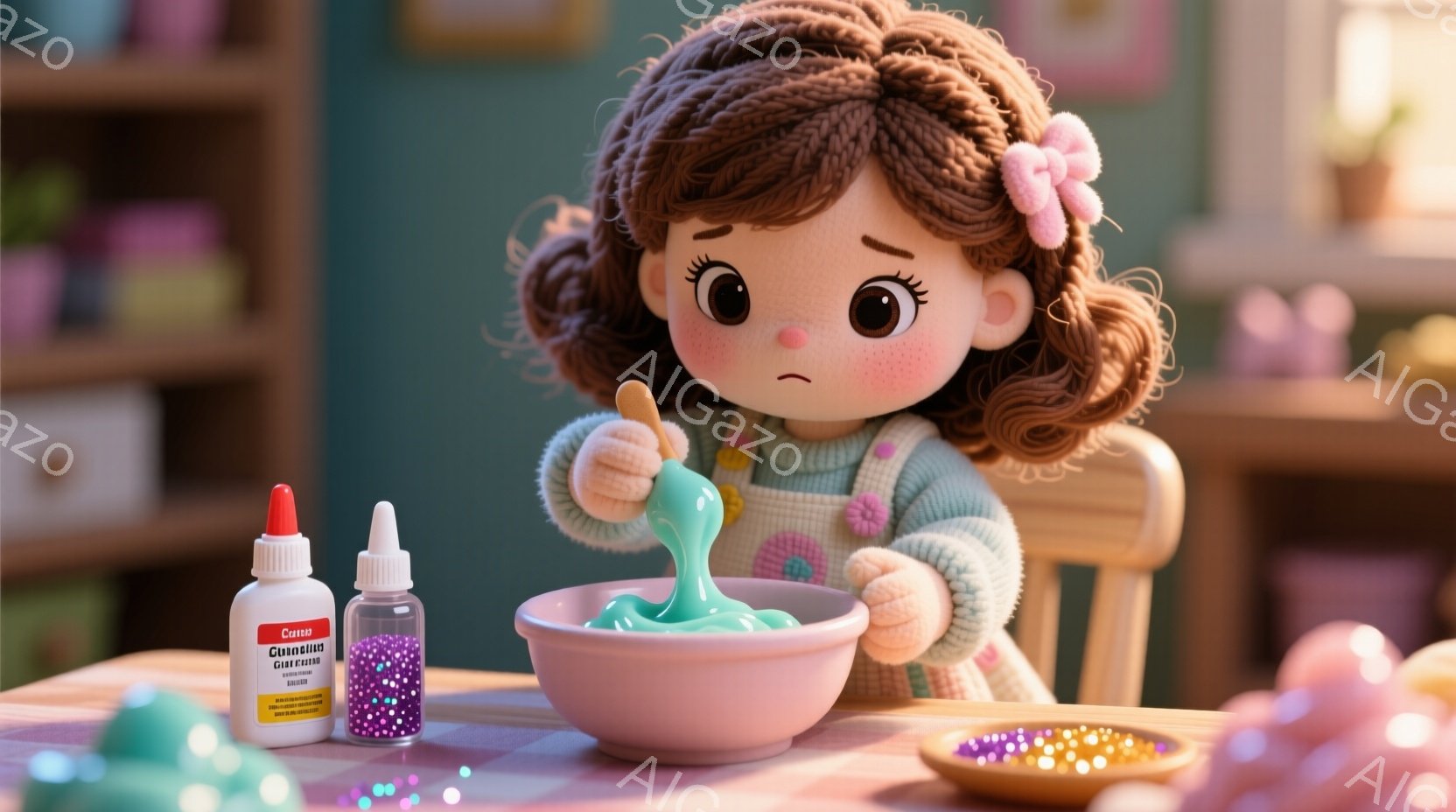 明るいピンク色の服を着た、巻き毛の女の子が、虹色のゼリーのようなものを茶色のボウルに注いでいる。彼女は笑顔で、少し体をかがめて、集中してゼリーを注いでいる様子だ。背景には他のカラフルなボウルや、洗濯機らしきものがぼやけて見え、全体的に温かく、遊び心のある雰囲気である。