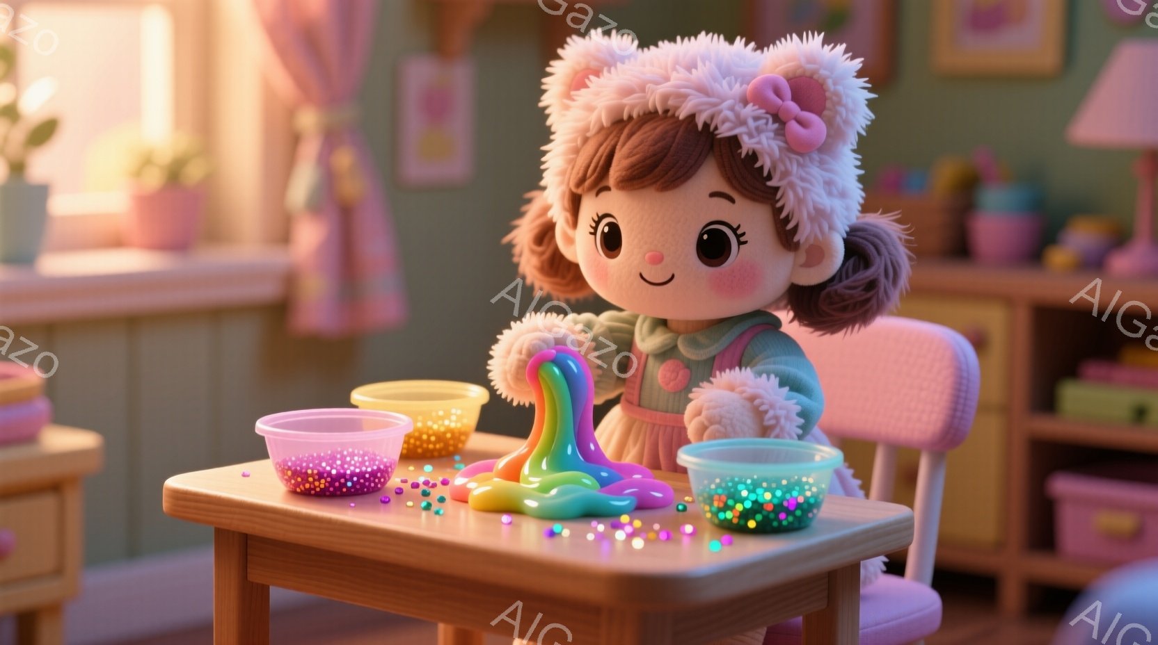 明るいピンク色の椅子に座った、ふわふわの髪と猫耳を持つ少女が描かれています。彼女はターコイズブルーのトップスとふわふわの白いショールを着ており、虹色のスライムを両手で楽しんでいます。背景には、カラフルな小道具や本棚が配置されており、温かく遊び心のある雰囲気を醸し出しています。