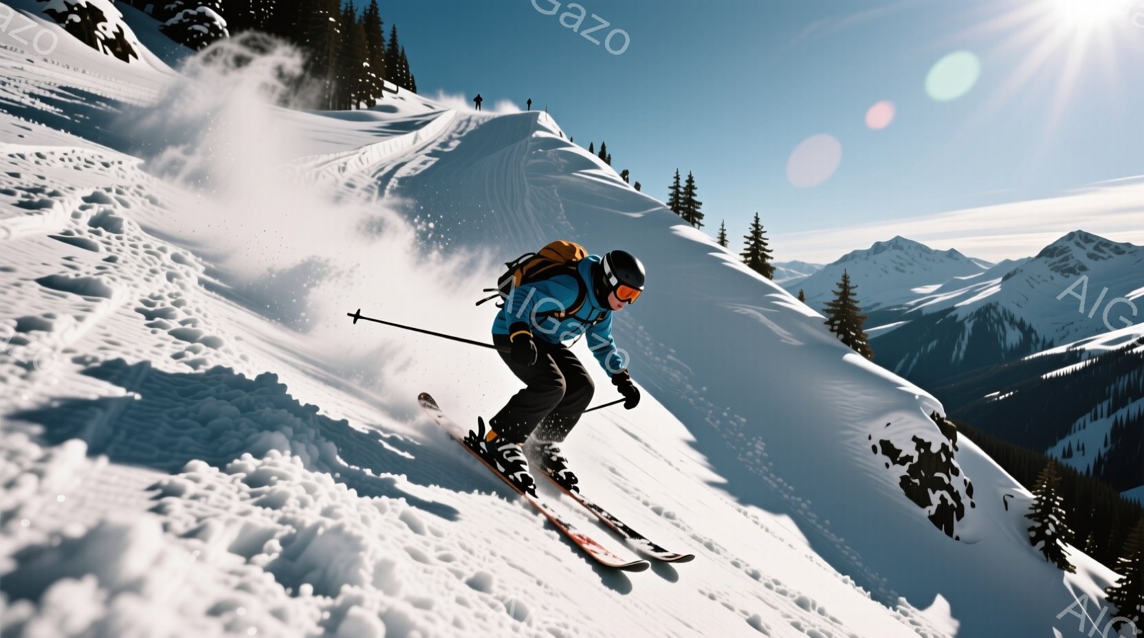 スキーヤーは急斜面を滑走しており、鮮やかなオレンジと黒のスキーウェア、ヘルメット、ゴーグルを着用しています。背景には雪を頂いた山々が連なり、晴天の下、スキーヤーの周囲には粉雪が舞っています。全体的に、爽やかで躍動感のある冬のスキーの情景が描かれています。