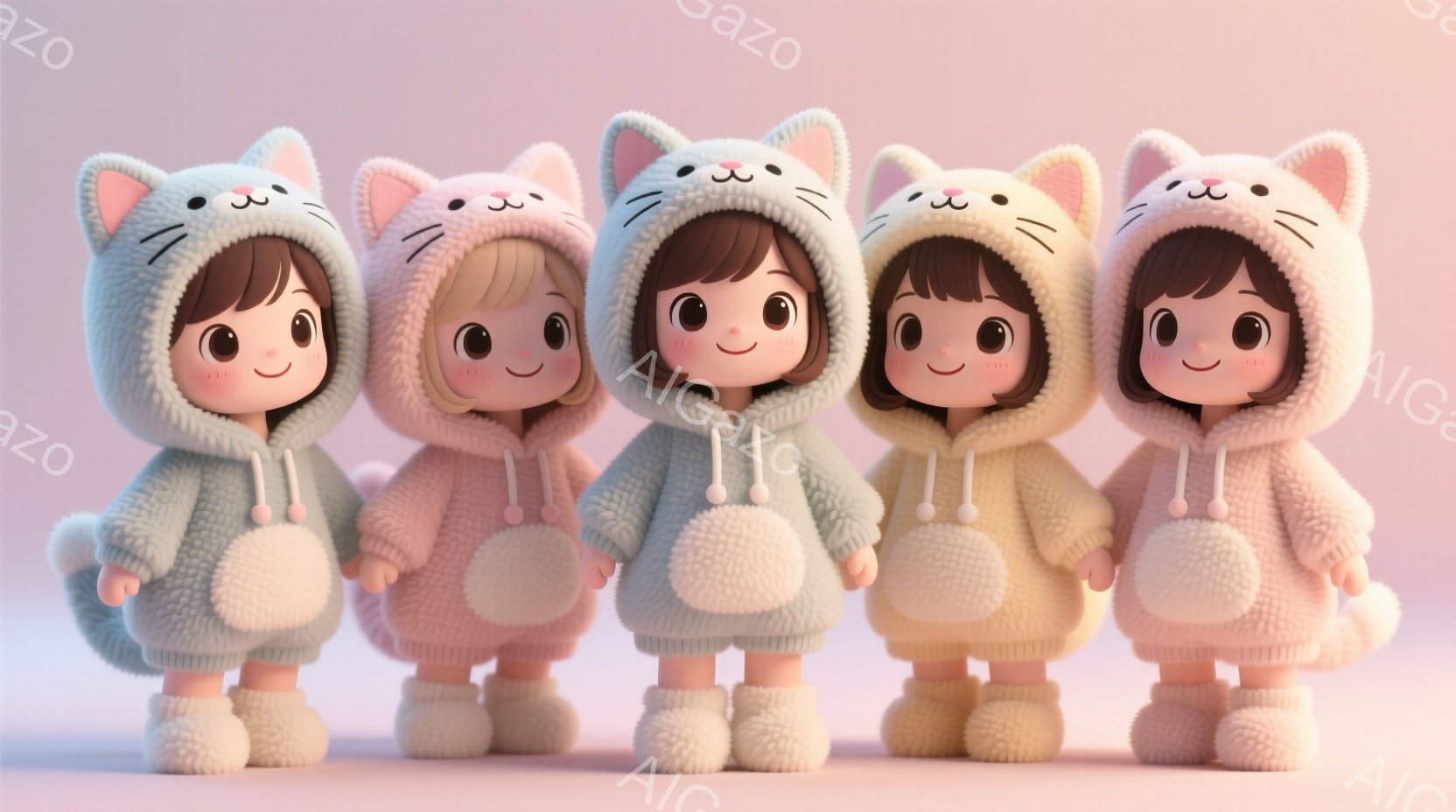 ふわふわとしたクリーム色のパーカーを着て、猫耳フードを被った可愛らしい女の子が四人並んでいます。彼女たちは短い茶色の髪をしており、つぶらな瞳で微笑んでいます。背景は淡いピンク色で、全体的に暖かく優しい雰囲気です。