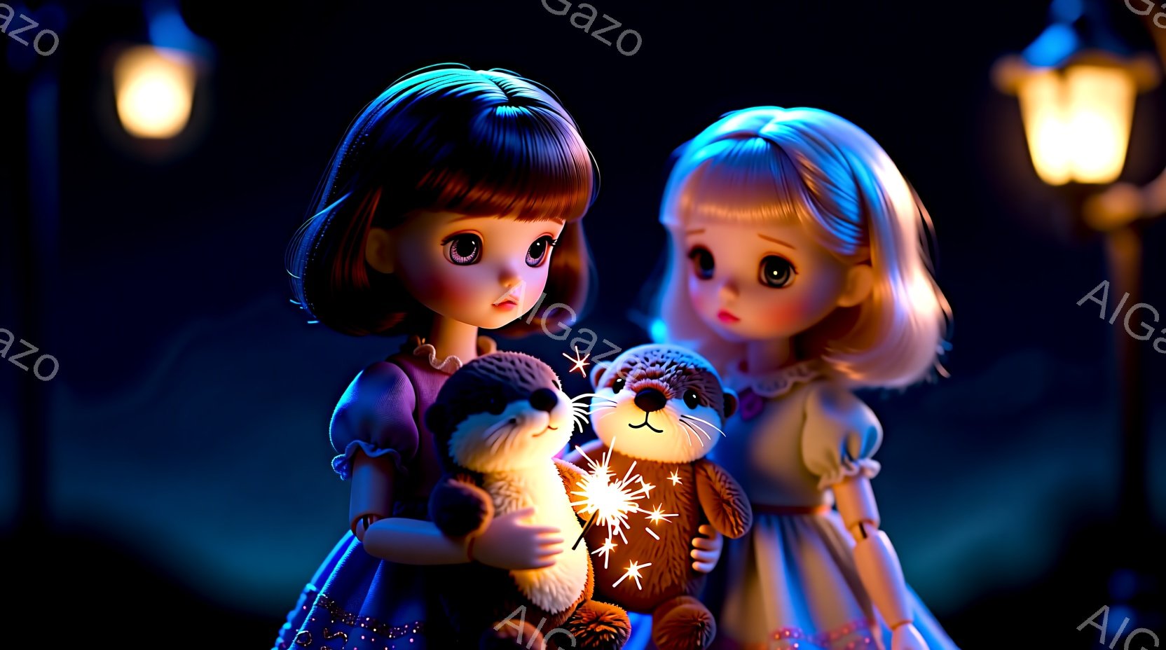 明るい屋外で、ピンク色のワンピースを着た、茶色の巻き毛の女の子が、それぞれ茶色の毛皮のカワウソの人形を抱きしめてベンチに座っています。彼女たちは微笑んでおり、その表情は幸せで無邪気です。背景には緑豊かな植物が見え、暖かく穏やかな雰囲気が漂っています。