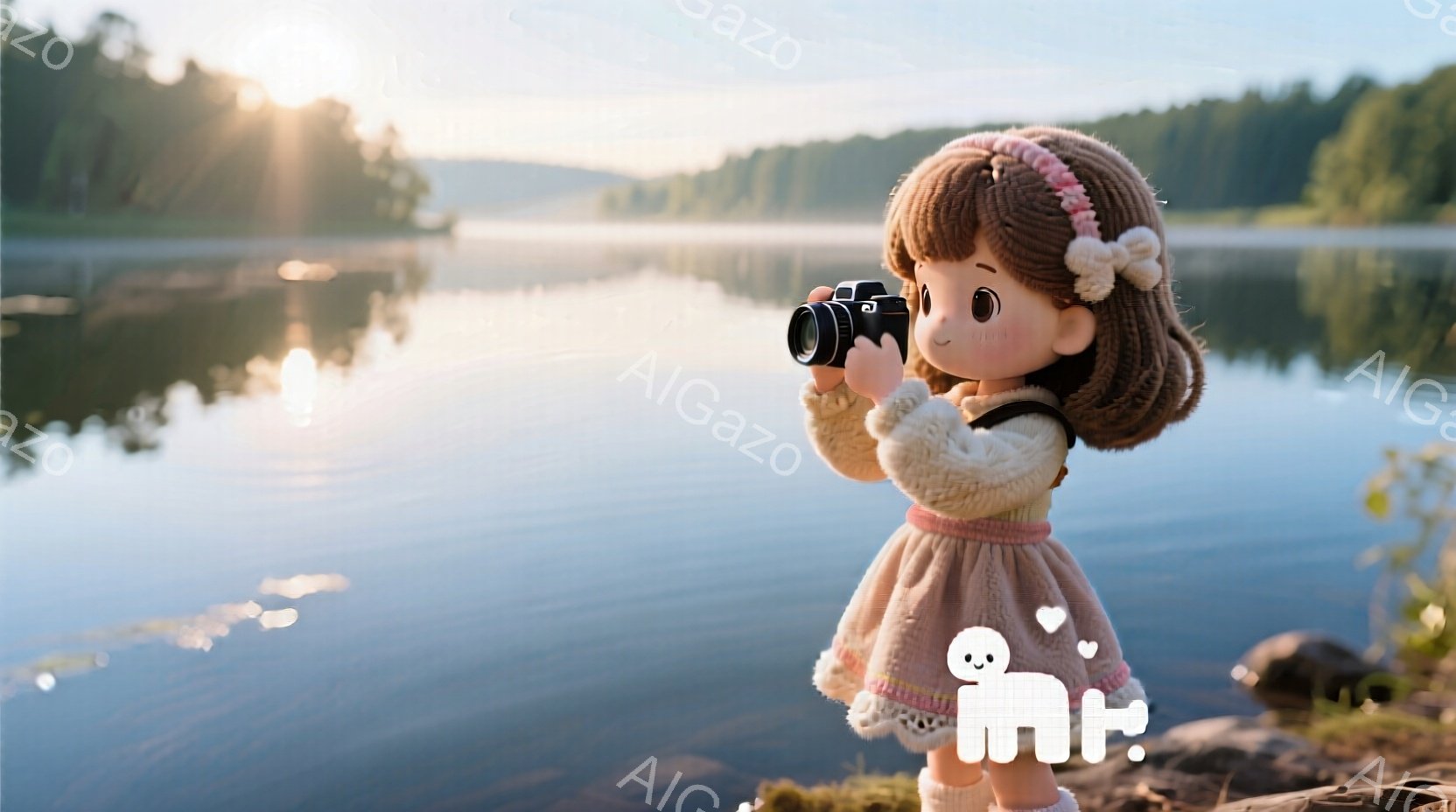 少女はニットのセーターとショールで暖かく身を包み、カメラを構えて何かを撮影しようとしている。彼女の髪は風になびき、背景には穏やかな波と夕焼けの美しい海が広がっている。全体的に、暖かくノスタルジックな雰囲気で、どこか懐かしい情景を感じさせる。