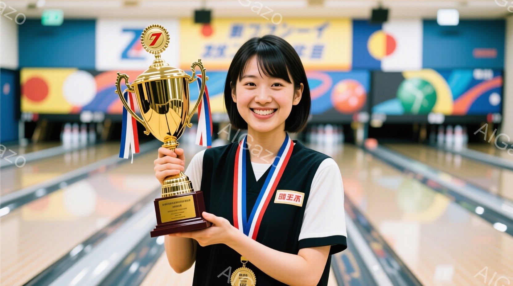 この女性はボウリング場に立ち、金色のトロフィーとメダルを誇らしげに掲げています。彼女は黒髪で、明るい笑顔を浮かべ、赤いポロシャツを着ています。背景には、カラフルなボウリングコースとレーンが見え、勝利と喜びの雰囲気が漂っています。