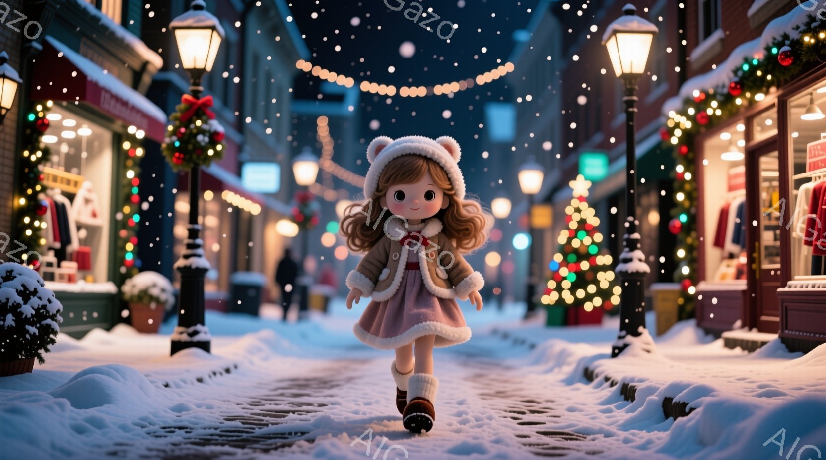 雪の降る公園のベンチに座る少女が描かれています。少女は赤いリボンとふわふわのイヤーマフが付いた茶色の髪型で、クリーム色のファーのトリミングが施された赤いドレスを着ています。彼女は両手に赤いリボンで結ばれた赤いプレゼントの箱を持っており、雪景色の中で温かく幸せな雰囲気を醸し出しています。