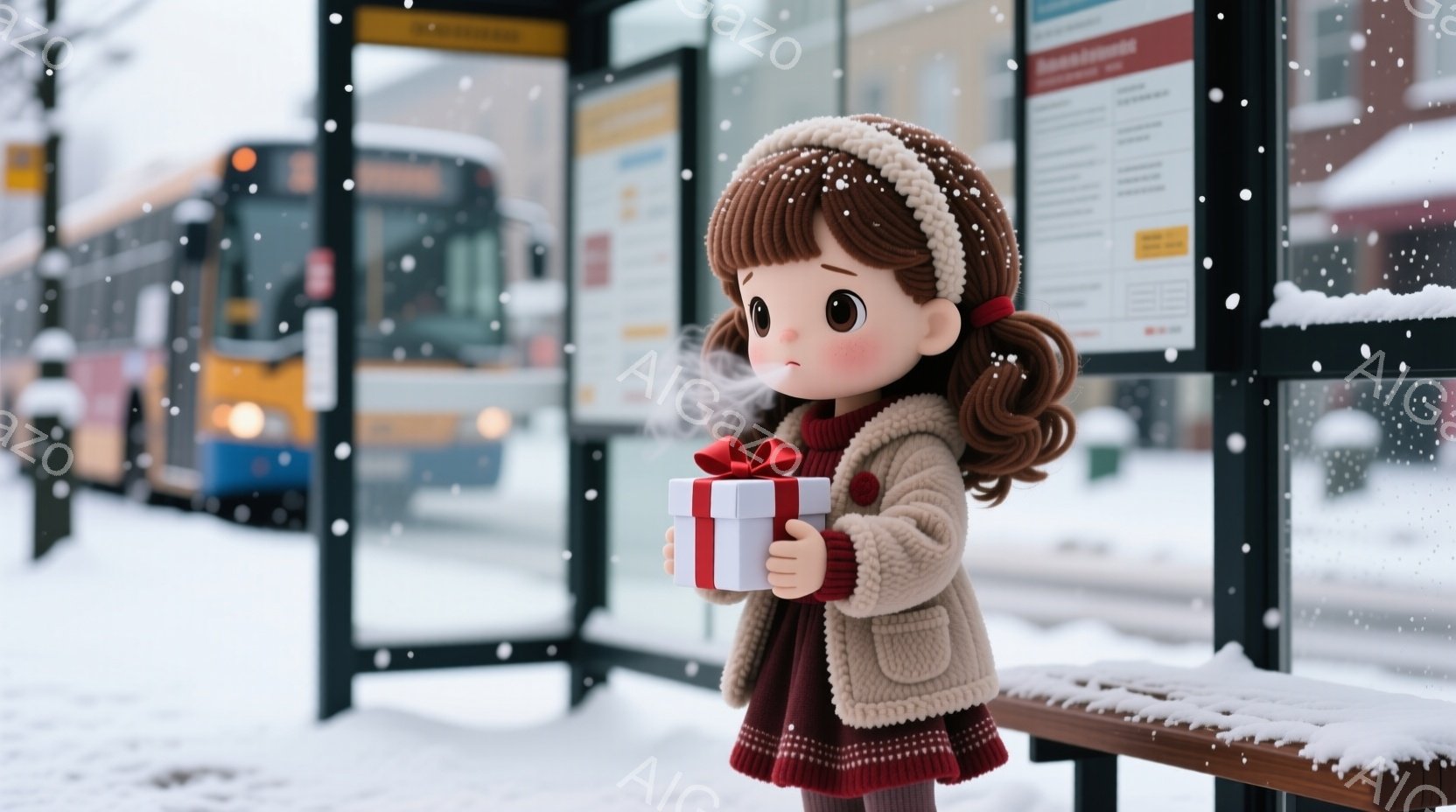 画像は雪が降るバス停に立つ、可愛らしい女の子を描いています。 クリーム色のふわふわした帽子とコート、チェック柄のスカート、そして白い靴を履いており、手に赤いリボンで飾られたプレゼントの箱を持っています。 背景には雪景色が広がり、ぼんやりと建物やバスが見え、全体的に暖かく、優しい雰囲気が漂っています。