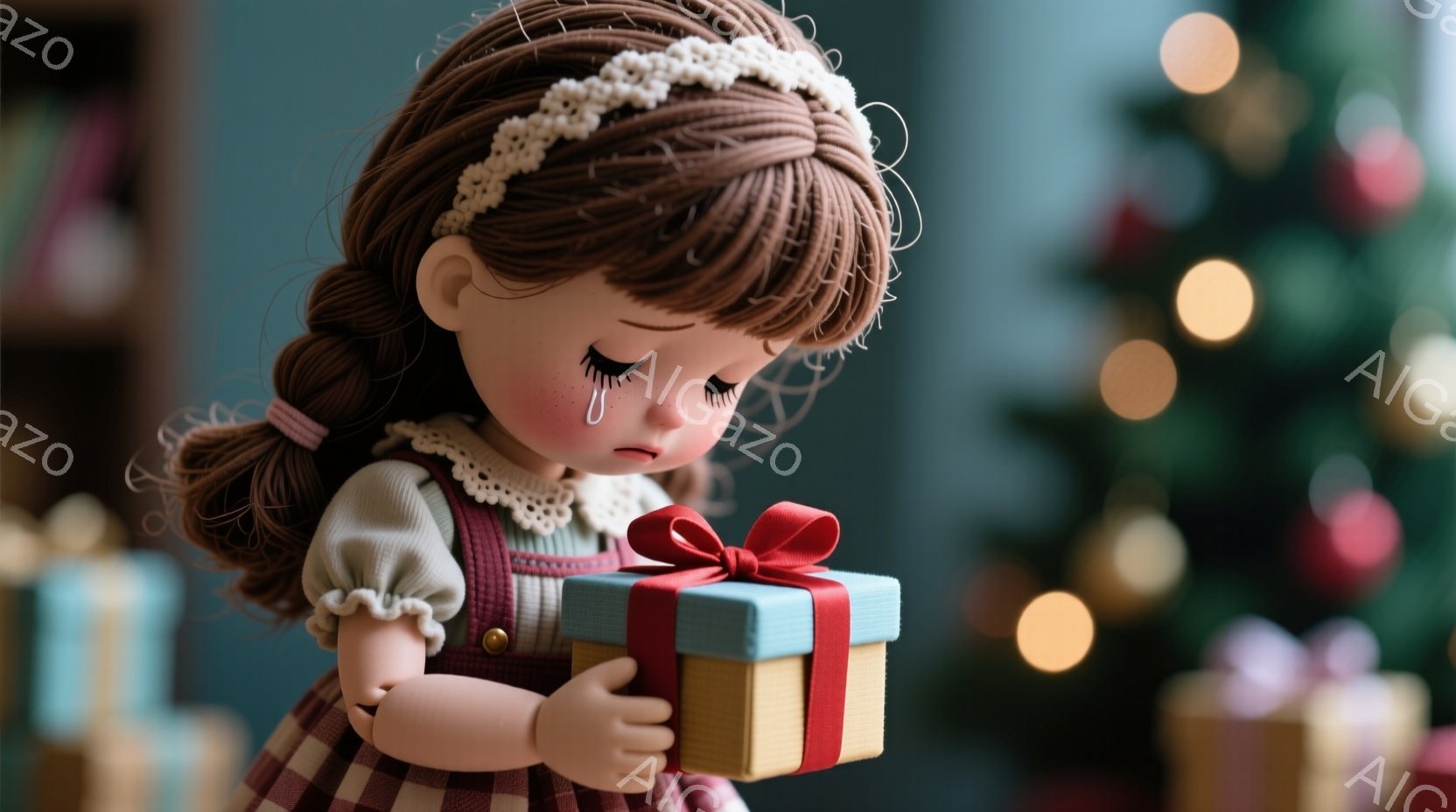 赤毛の巻き髪に白いリボンをつけた少女の人形が、チェック柄のワンピースとベストを着て、両手を前に出して何かを受け取ろうとしています。背景は緑豊かな芝生とぼやけた光のぼかしで、まるでクリスマスの飾り付けのようであり、温かく優しい雰囲気を醸し出しています。誰かが人形に白いリボンで結ばれた白いギフトボックスを差し出している様子が捉えられています。