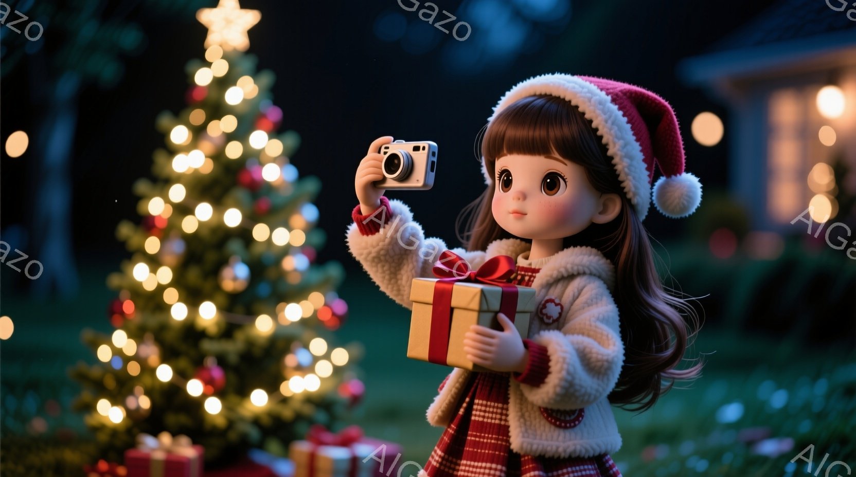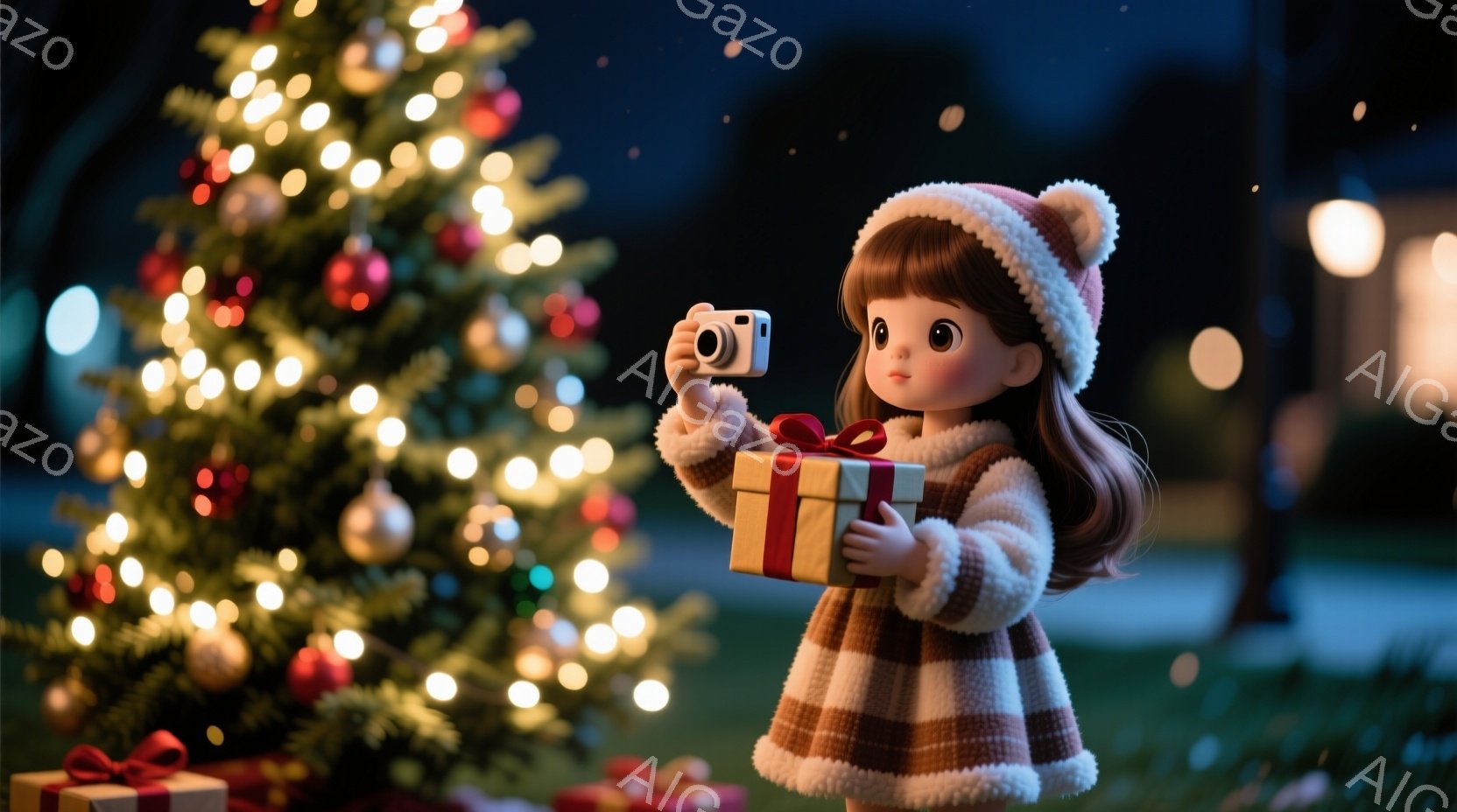 クリスマスツリーのそばにいる少女は、赤いサンタ帽をかぶり、ふわふわの白いコートとチェックのスカートを着ています。彼女はプレゼントの箱を持って、スマートフォンで写真を撮るポーズをとっており、嬉しそうな表情をしています。背景にはぼやけた家々と、きらめくクリスマスライトがあり、暖かく幻想的な雰囲気を醸し出しています。