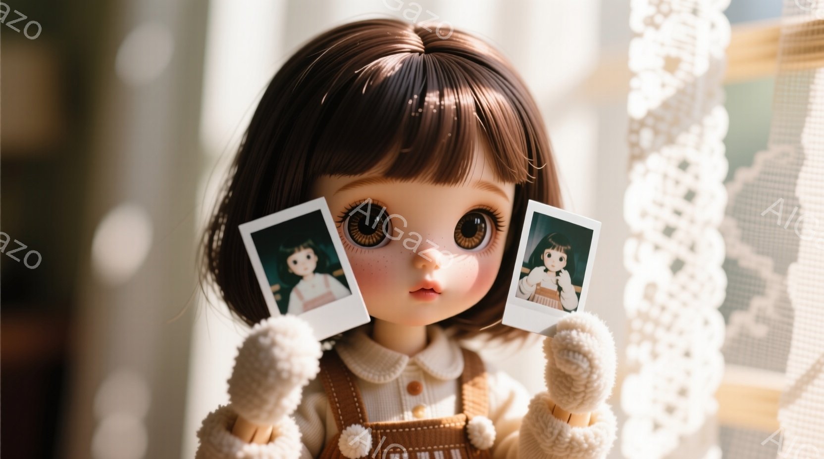 大きな瞳を持つ人形が、2枚のインスタント写真を手に持っている様子を捉えています。人形は、オフホワイトのセーターと濃い青色のオーバーオールを着ており、髪は茶色でストレートカットです。背景には白いカーテンがぼんやりと見え、室内で撮影された柔らかな光が全体を包んでいます。