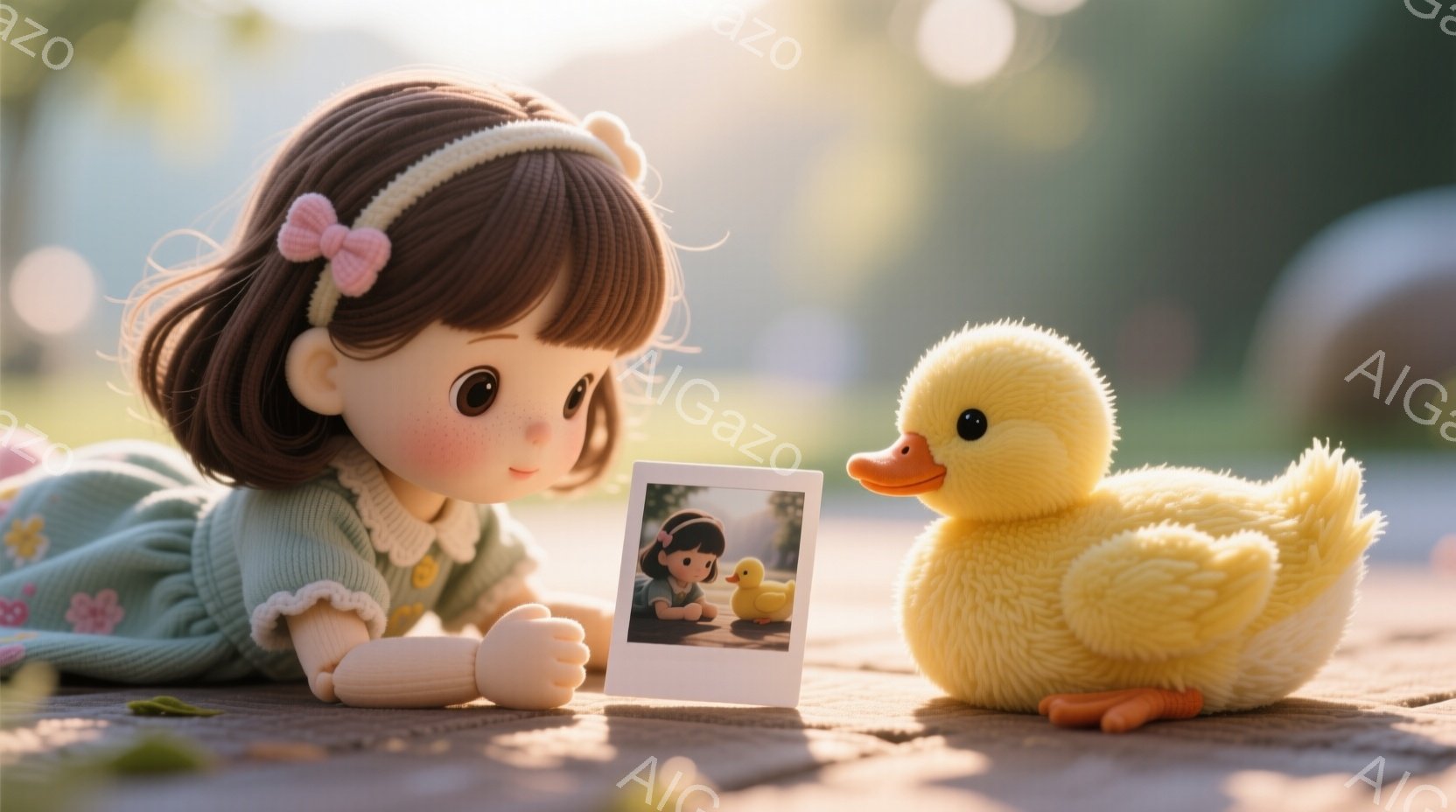 明るい部屋の床に横たわる幼い女の子が、小さな写真を見つめています。ピンク色のリボンで結んだ茶色の髪と、水色の縁取りが施されたクリーム色のセーターを着ています。隣にはふわふわの黄色いアヒルのぬいぐるみがおり、温かく穏やかな雰囲気が漂っています。