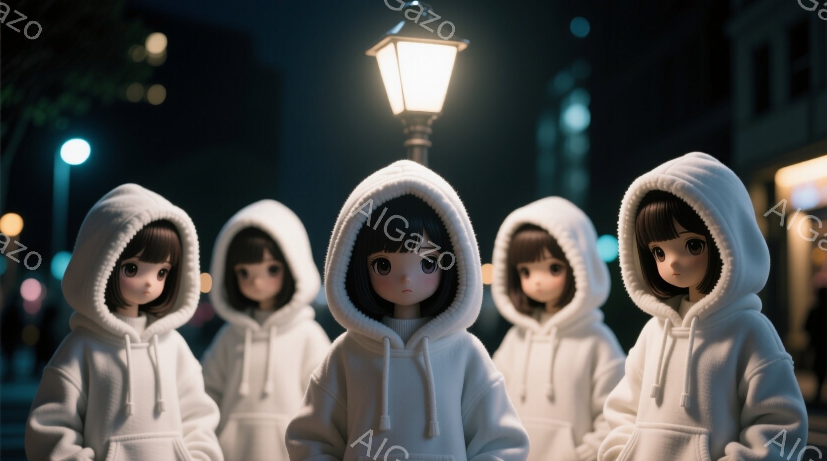 五人の少女が夜の街に並んで立っている。全員白いフード付きのスウェットシャツを着ており、黒い髪をフードの下で隠している。背景には建物と街灯があり、夜の静かで少し不気味な雰囲気を醸し出している。