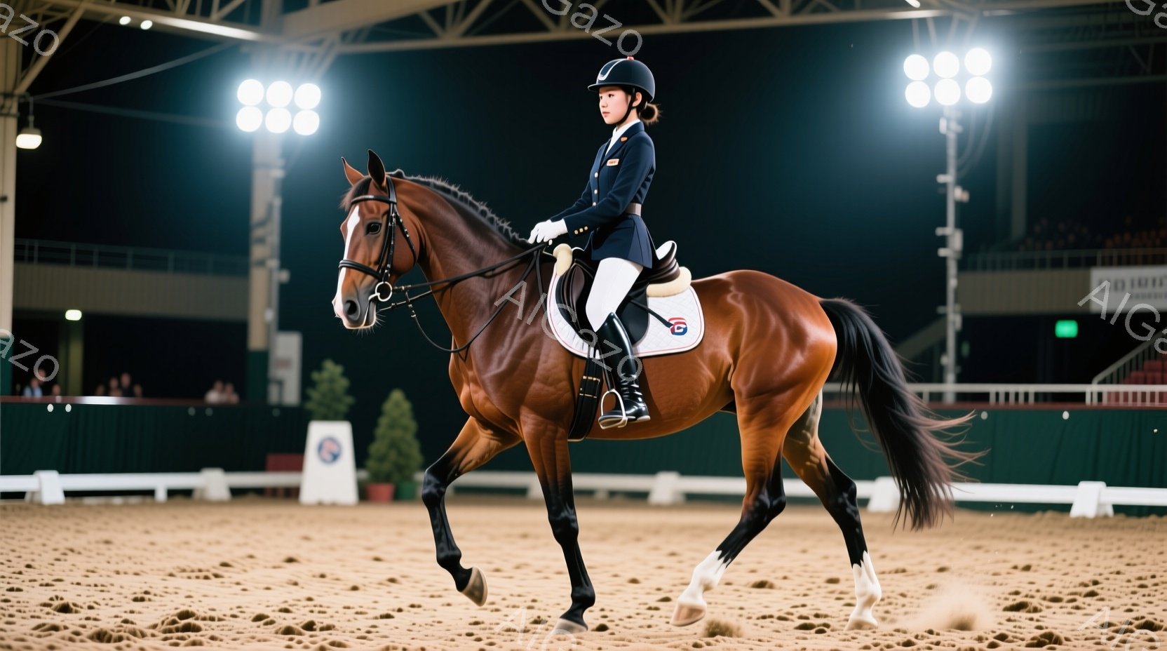 競技用の服装を着た若い女性が写っています。彼女は濃い青色のジャケット、白いズボン、黒いブーツを着用し、頭には黒いヘルメットをかぶっています。競技場の中央で両手を横に広げ、自信に満ちた表情で立っており、周囲には白い障害物や観客席が見え、競技の雰囲気が漂っています。