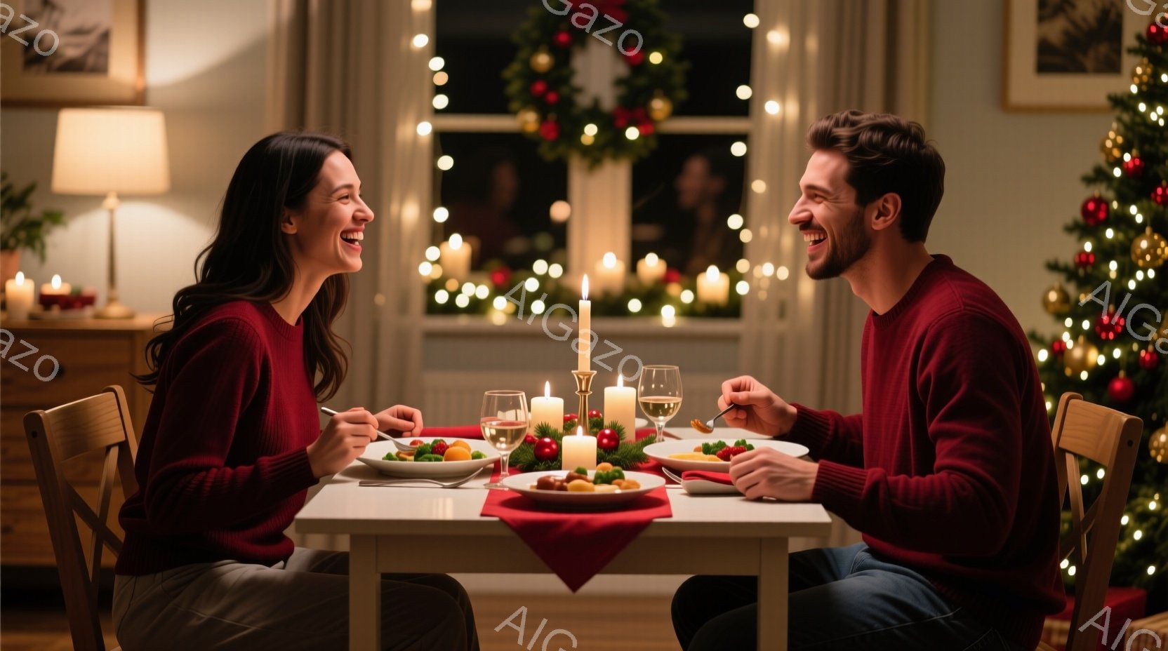 若い男女がダイニングテーブルを挟んで向かい合って食事をしている。女性は赤色のセーターを着ており、髪は肩まで伸びていて、満面の笑みを浮かべている。背景にはクリスマスツリーや飾り付けがあり、温かくロマンチックな雰囲気が漂っている。