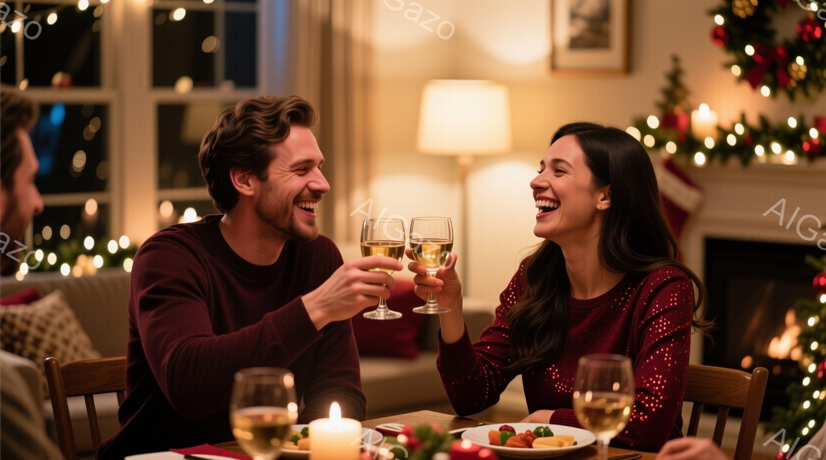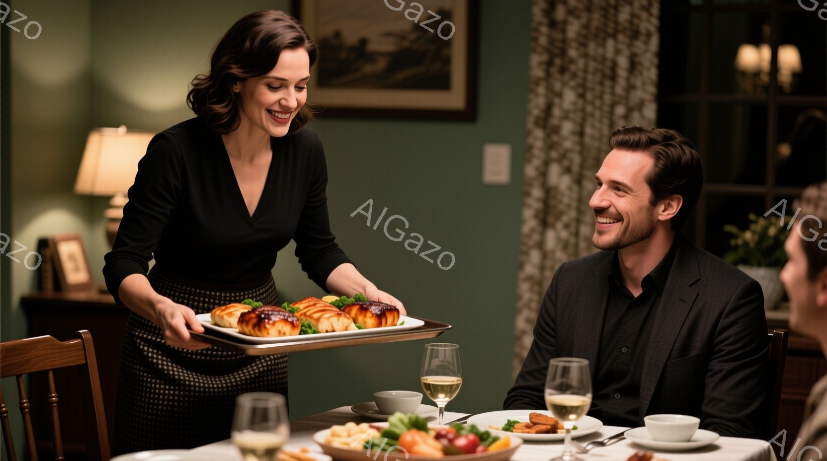 長い茶色の髪を無造作にまとめた女性が、エプロン姿で料理の盛り合わせの皿を両手で差し出している。男性は紺色のジャケットと水色のシャツを着て、食卓を囲み、笑顔で女性を見つめている。背景には暖色の壁と間接照明、そして食卓にはワイングラスや料理が並び、温かく居心地の良い家庭的な雰囲気を感じさせる。