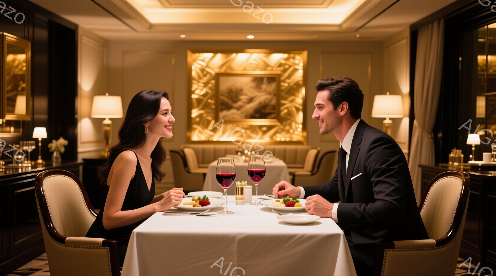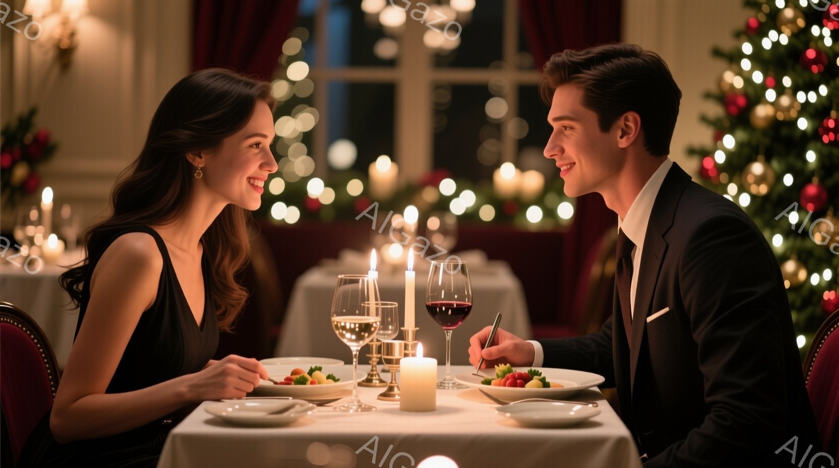 鮮やかなクリスマスツリーを背景に、フォーマルな服装をした男女がレストランで向かい合って食事をしている。男性は黒いスーツにネクタイ、女性は黒いドレスを着ており、お互いを見つめ合い、少し微笑んでいる様子が見て取れる。キャンドルやワイングラスが置かれたテーブルと、暖かな光が、ロマンチックで特別な雰囲気を作り出している。