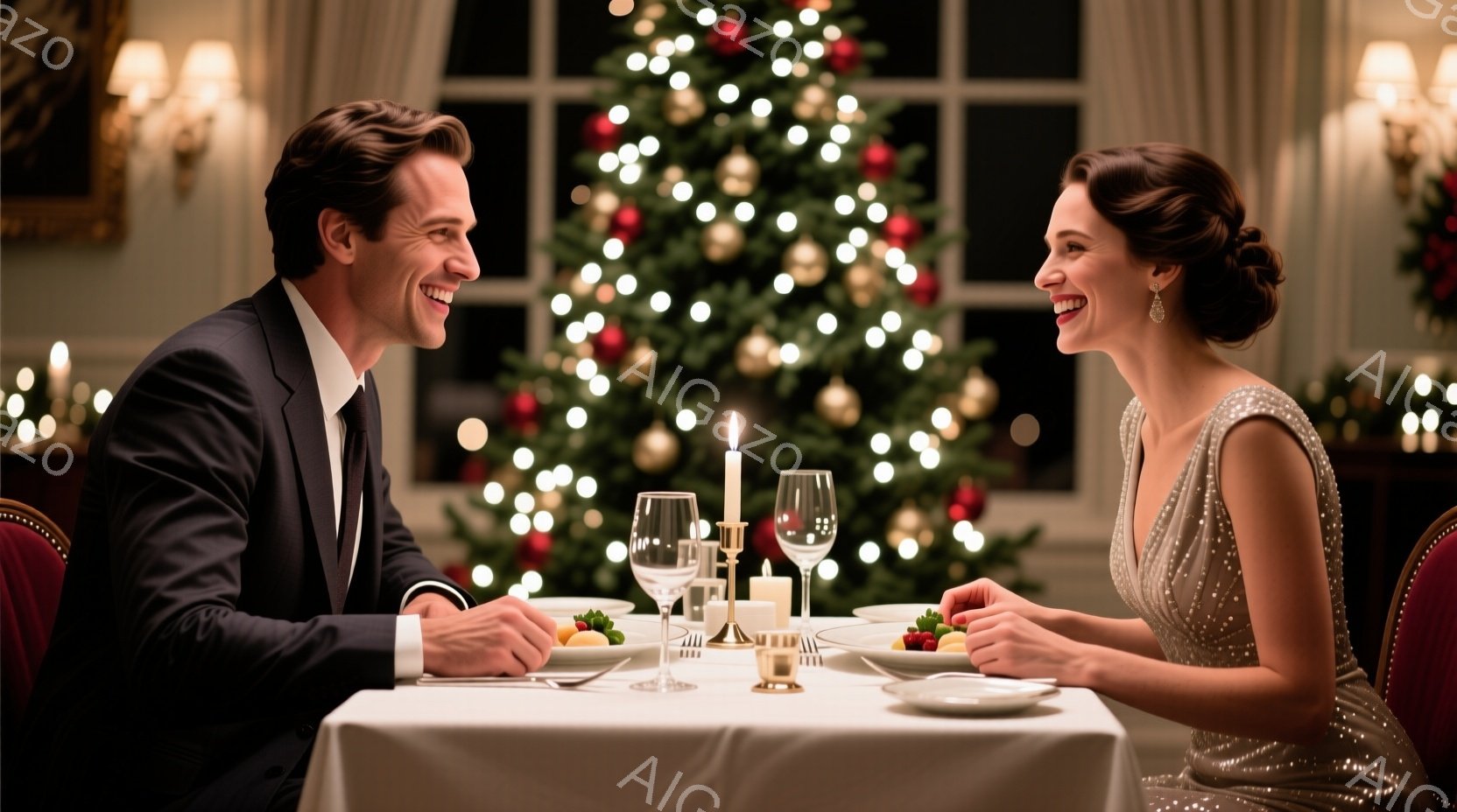 豪華なレストランで、一対の男女が向かい合って食事を楽しんでいます。男性は黒いスーツに白いシャツ姿で、満面の笑みを浮かべており、女性はキラキラと輝くベージュのドレスを身につけ、同じく笑顔を浮かべています。背景には、華やかなクリスマスツリーが飾られ、暖かくロマンチックな雰囲気が漂っています。