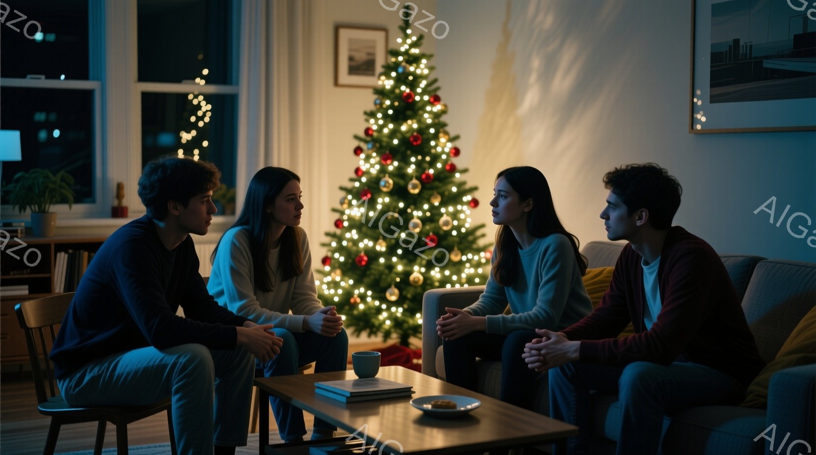 部屋にはクリスマスの飾り付けがされており、クリスマスツリーが明るく輝いている。四人の若い男女がソファに座り、顔を見合わせている様子から、何か真剣な話をしている雰囲気である。彼らはカジュアルな服装で、リラックスした姿勢だが、表情からは少し緊張感も感じられる。