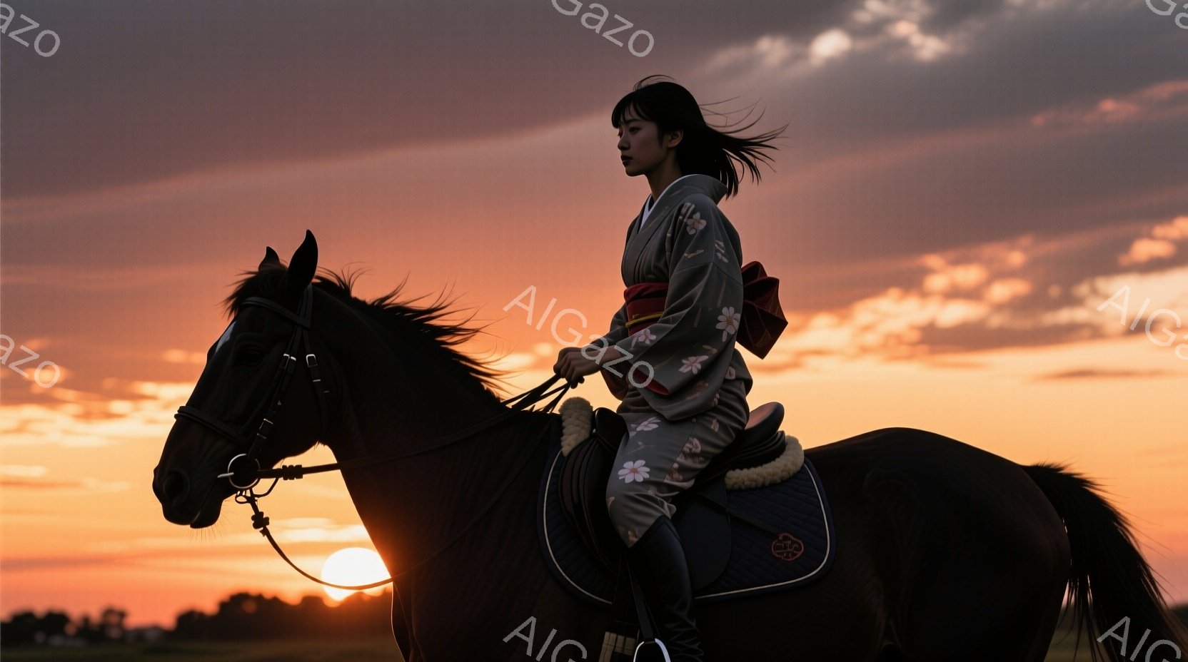 夕焼けを背景に、黒い馬に乗った女性が描かれている。女性は着物を着ており、髪を後ろで結んでいる。馬は草原を走り、強いシルエットを描き、周囲の風景と調和している。
