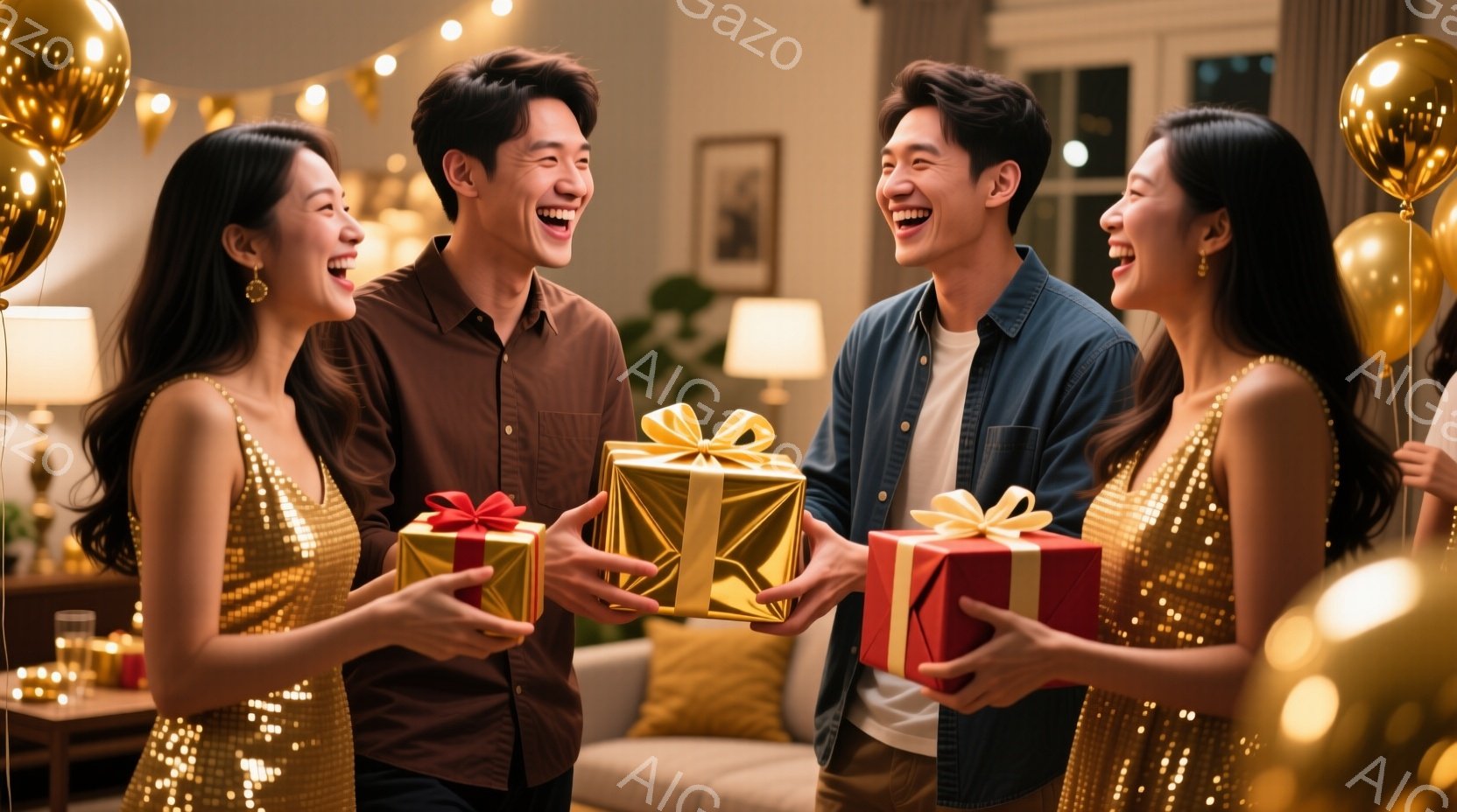 複数の人々がプレゼントを抱えて笑顔で集まっています。女性たちはキラキラと輝くゴールドのドレスを着ており、男性は茶色のシャツを着ています。背景には、ぼやけたリビングルーム、キャンドル、そして金色の風船が見え、お祝いの雰囲気を感じさせます。