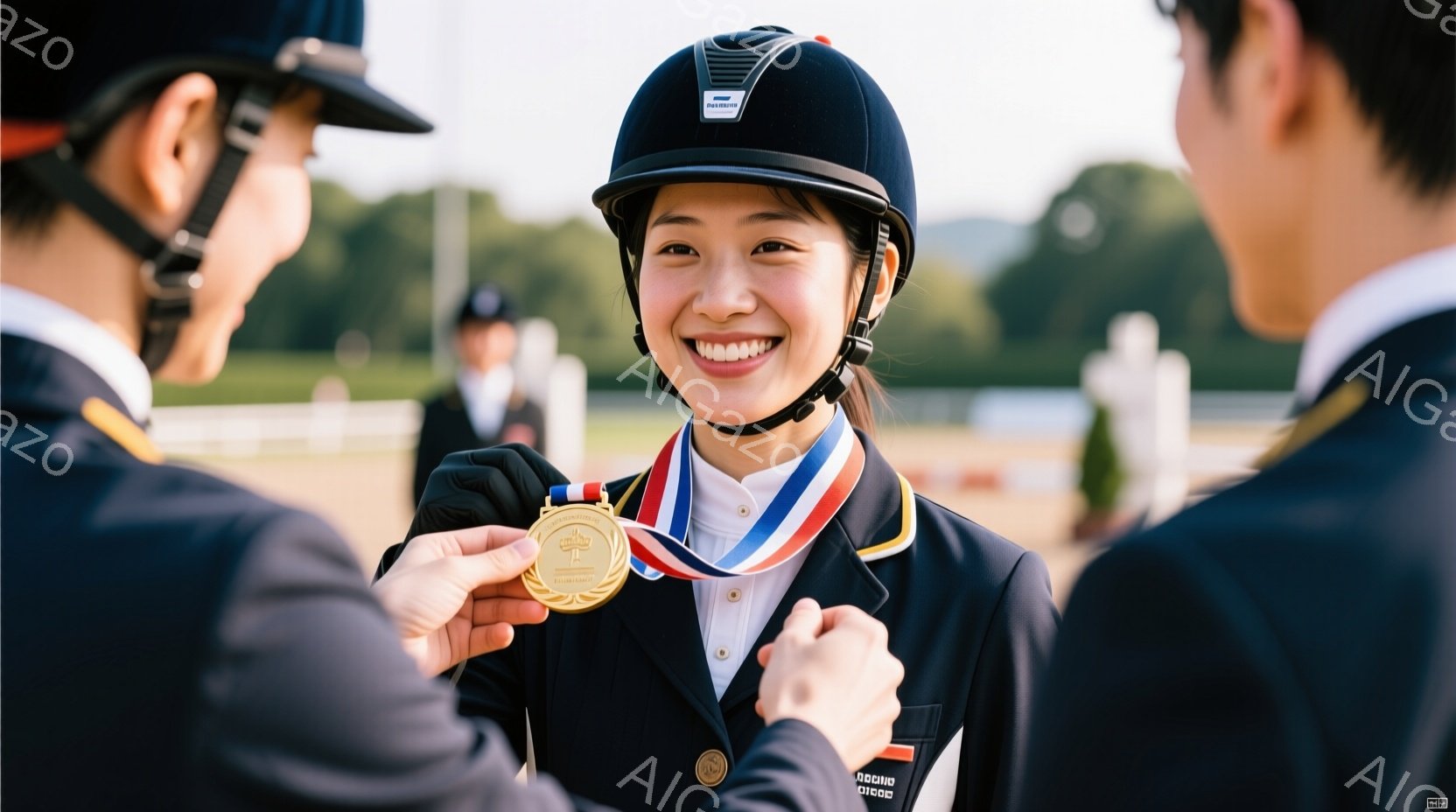 黒い乗馬ヘルメットを被った若い女性が、金色のメダルを受け取ろうとしています。彼女は紺色のジャケットに白いシャツを着ており、満面の笑顔を浮かべています。背景には緑豊かな自然と、他の競技者や馬が見え、晴れた日の屋外競技大会の様子が伺えます。